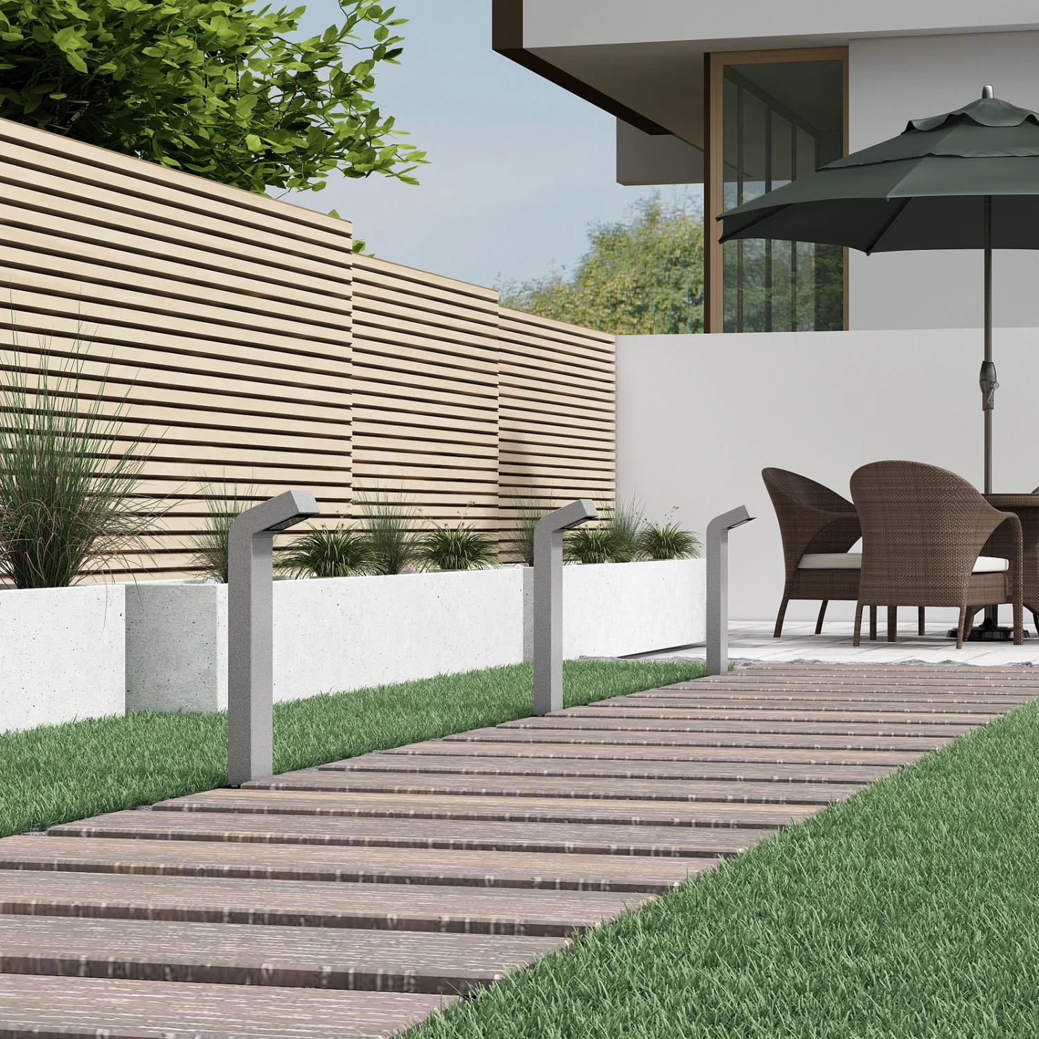 Ein stilsicheres Aussehen und für den Außenbereich praktische Eigenschaften vereint die LED-Wegeleuchte Vavara. Ihr Leuchtenkörper besteht aus grauem Beton und erhebt sich aus einem breiten Standfuß und endet in einem Winkel, in dem eine festverbaute LED sitzt. Durch den Winkel scheint das erzeugte Licht schräg zu Boden und eignet sich hervorragend für die Beleuchtung eines Weges im Garten oder in der Einfahrt. Durch die Schutzart IP65 ist die LED-Pollerleuchte Vavara ausgestattet für alle Wetterbedingungen vor der Haustür, denn sie ist staubdicht und gegen Strahlwasser geschützt. Ihr dezentes Aussehen macht es möglich, sie im Garten aufzustellen, ohne dass sie den Baustil des Hauses bricht oder die restliche Dekoration auf der Terrasse in den Schatten stellt. Durch ihren schlanken Körper passt die Pollerleuchte hervorragend an die Seite eines Weges, ihre festverbauten LEDs generieren ein warmweißes Licht und sorgen für ein passendes Ambiente.