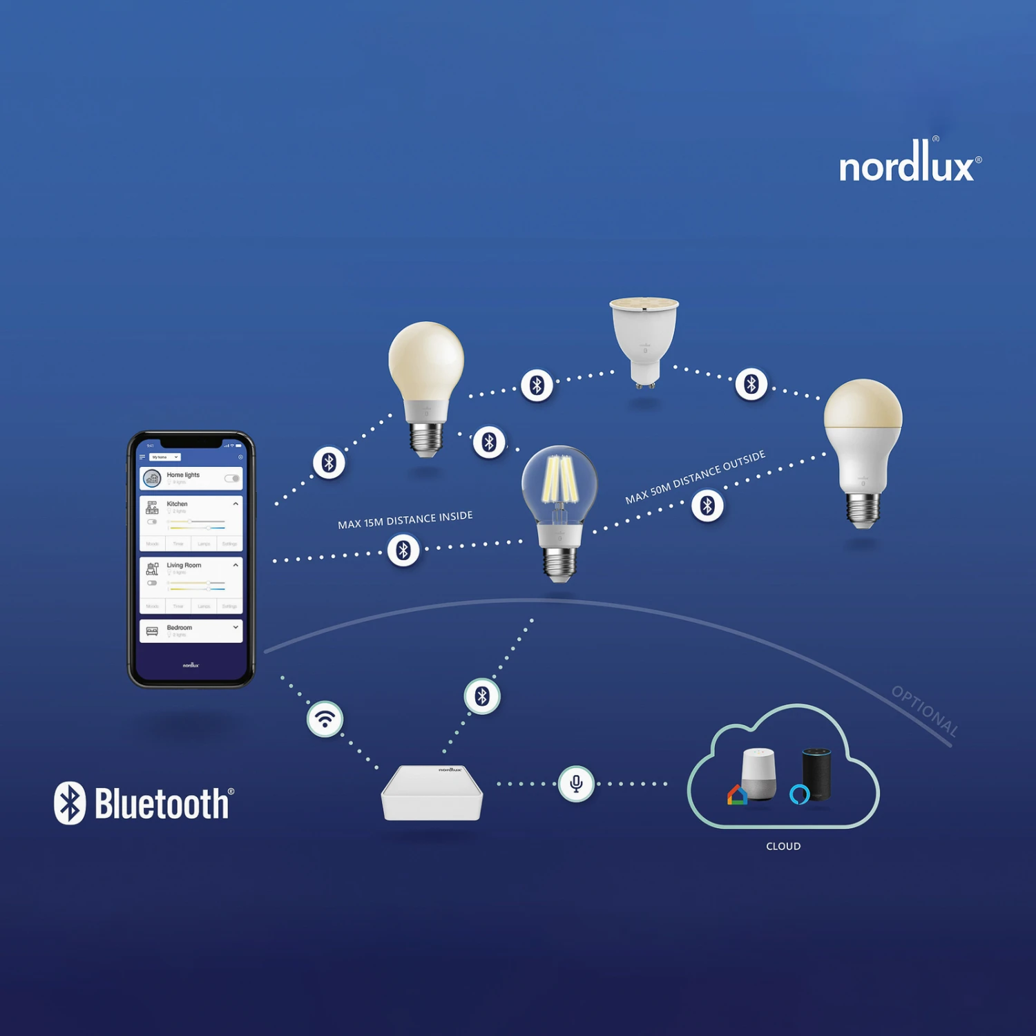 Die Smart Bridge erweitert die Funktionen und Einstellungen der Nordlux Smart Produkte. Die Leuchten und Leuchtmittel werden über die Bluetooth-Mesh-Technologie gesteuert. Über die Bridge ist es möglich, Zeitpläne und Programme zu konfigurieren, das Licht in den eigenen vier Wänden von überall zu steuern und eine Anwesenheitssimulation zu aktivieren, wenn man z.B. im Urlaub oder an der Arbeit ist. Außerdem können die Leuchten dank der Bridge auch per Sprache gesteuert werden. Die Nordlux Smart Artikel sind mit den Sprachassistenten Amazon Alexa und Google Home kompatibel.