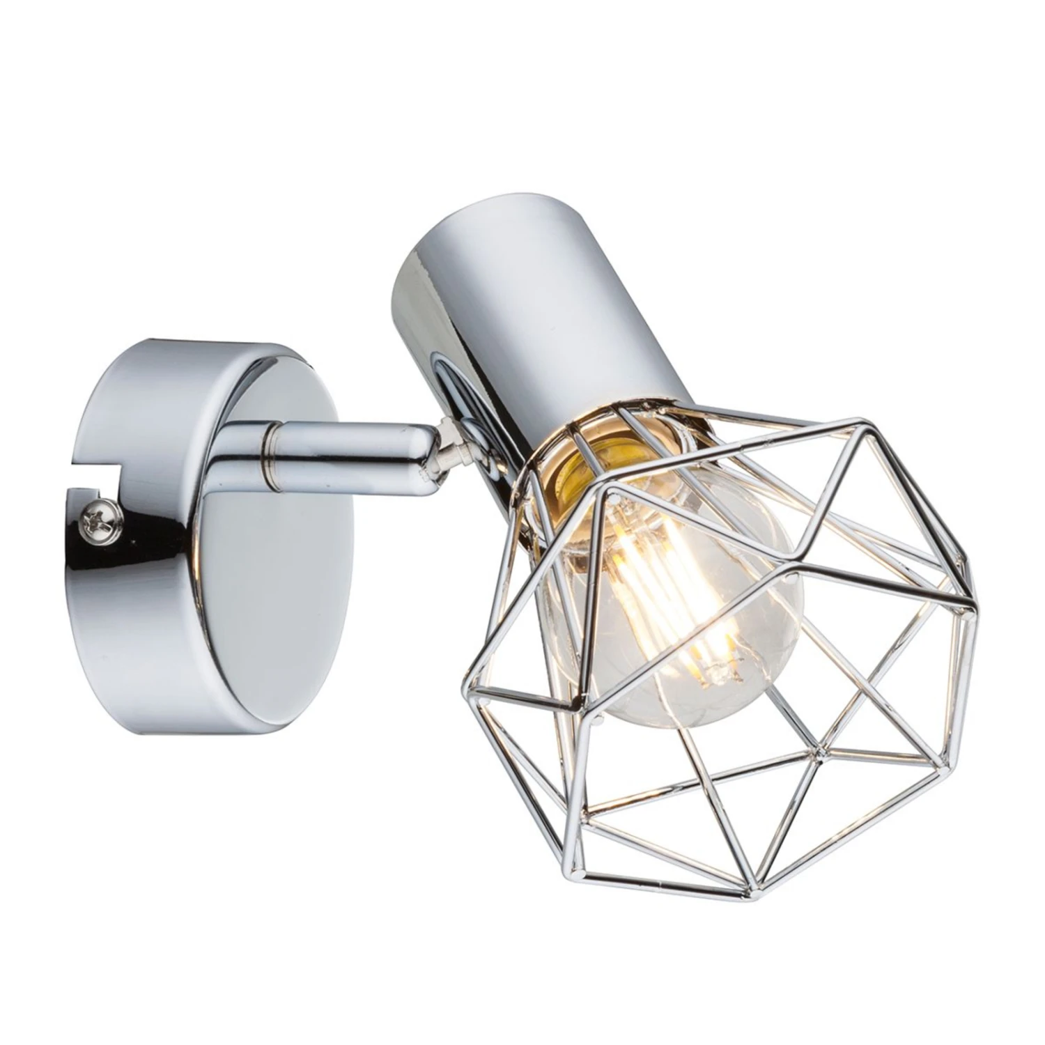 Der Wandstrahler Daiva bietet sich als sehr dekorative Variante unter den Strahlerleuchten an: Wandhalterung und Fassung präsentieren sich noch sehr dezent, der Schirm jedoch in eher ungewöhnlicher Optik: Er besteht einfach nur aus einem verchromten Metallkäfig, der den Blick auf das Leuchtmittel frei lässt. In die Fassung kann ein E14-Leuchtmittel mit max. 40 W eingesetzt werden. Da das Leuchtmittel zu sehen ist, bietet sich die Verwendung einer besonders dekorativen Lampe, wie z. B. eine Retrofit-Glühlampe, an. Passende Leuchtmittel sind unter Zubehör erhältlich.