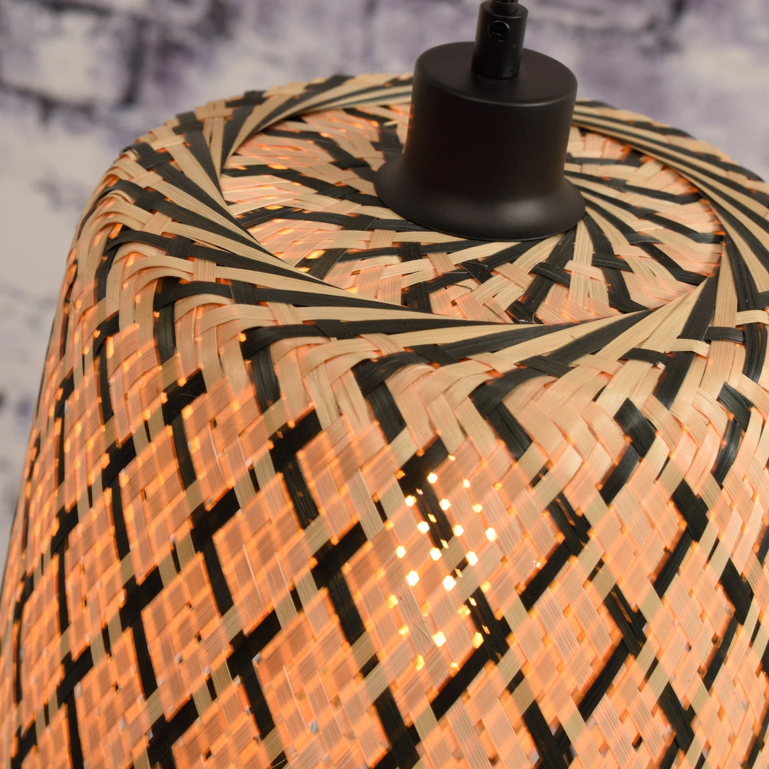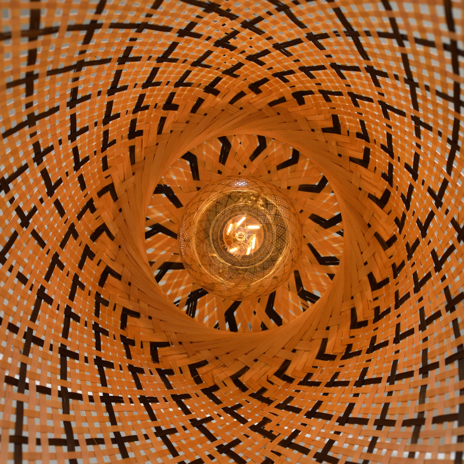 Das Flechtmuster ist geprägt von zarten Zwischenräumen, die das Licht auch rundherum austreten lassen und somit eine angenehme Allgemeinbeleuchtung erzeugen. In das naturfarbene Muster wurden auch schwarze Bambus-Elemente mit eingearbeitet, wodurch der Schirm seine besondere Optik erhält. Kalimantan eignet sich ideal zur Beleuchtung von kleinen Tischen oder Tresen oder auch zu mehreren installiert für größere Bereiche.