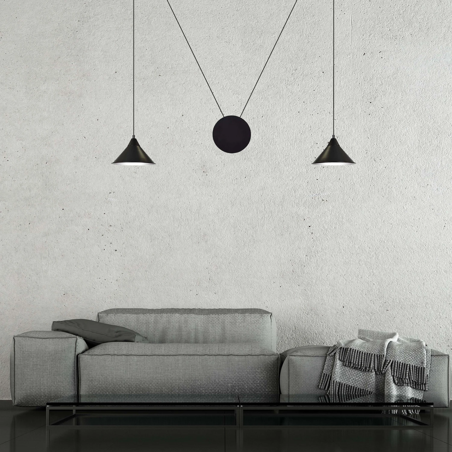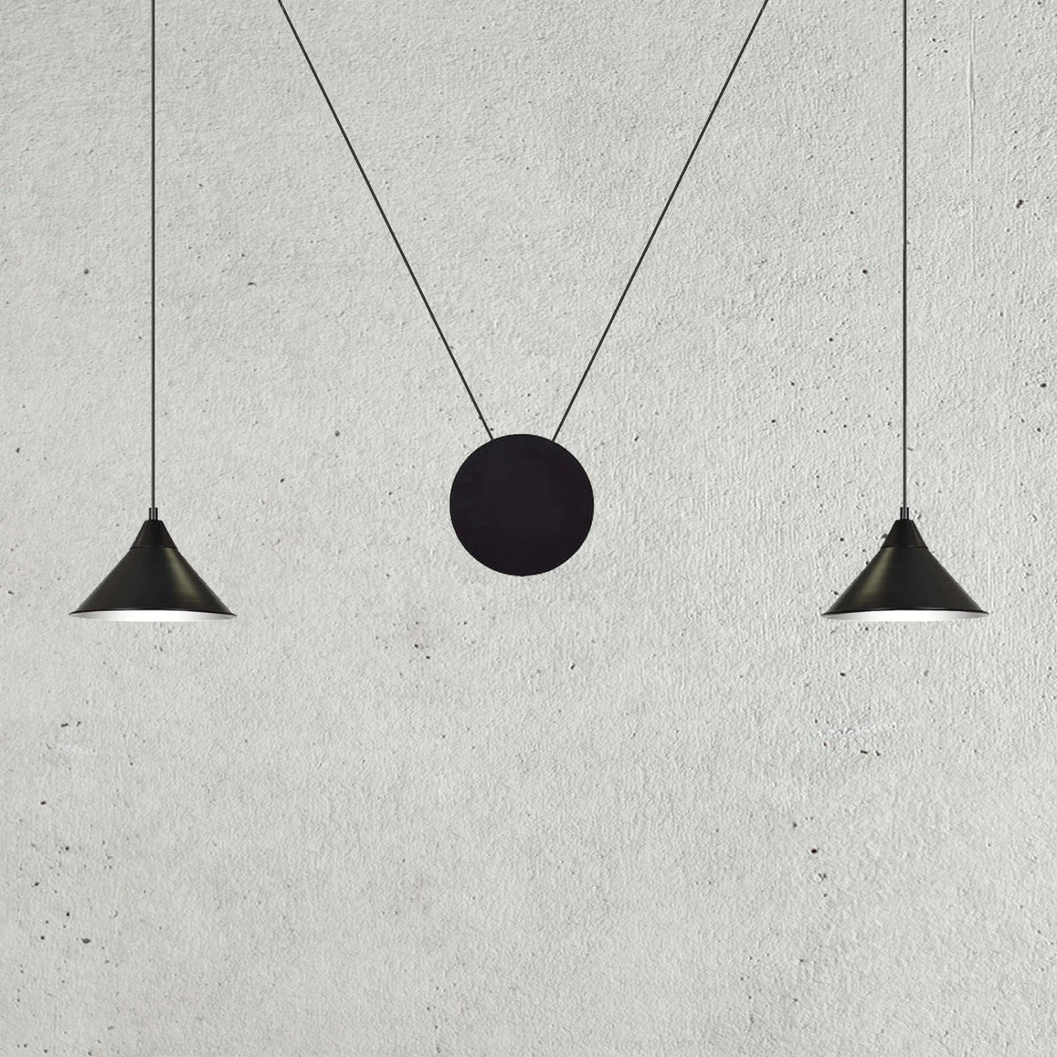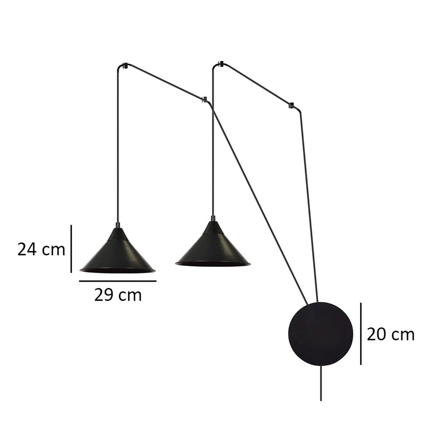 Bei der zweiflammigen Hängeleuchte Ramo fällt zuerst die runde Halterung ins Auge. Diese kann an der Wand oder wahlweise an der Decke montiert werden. Über zwei Kabel, die mit Klammern an der Decke befestigt werden, hängen ihre kompakten Schirme ab. Diese bieten jeweils Platz für ein E27-Leuchtmittel (separat über das Zubehör erhältlich). Strom bekommt Ramo über die Steckdose und kann per Schalter am Kabel ein- und ausgeschaltet werden.