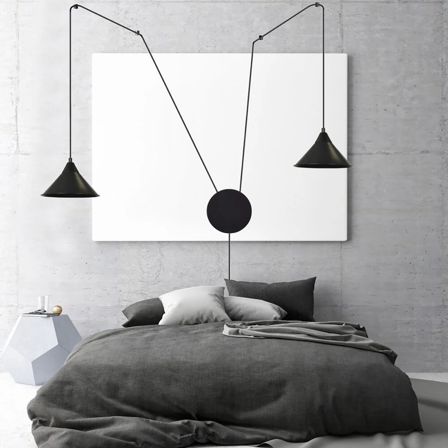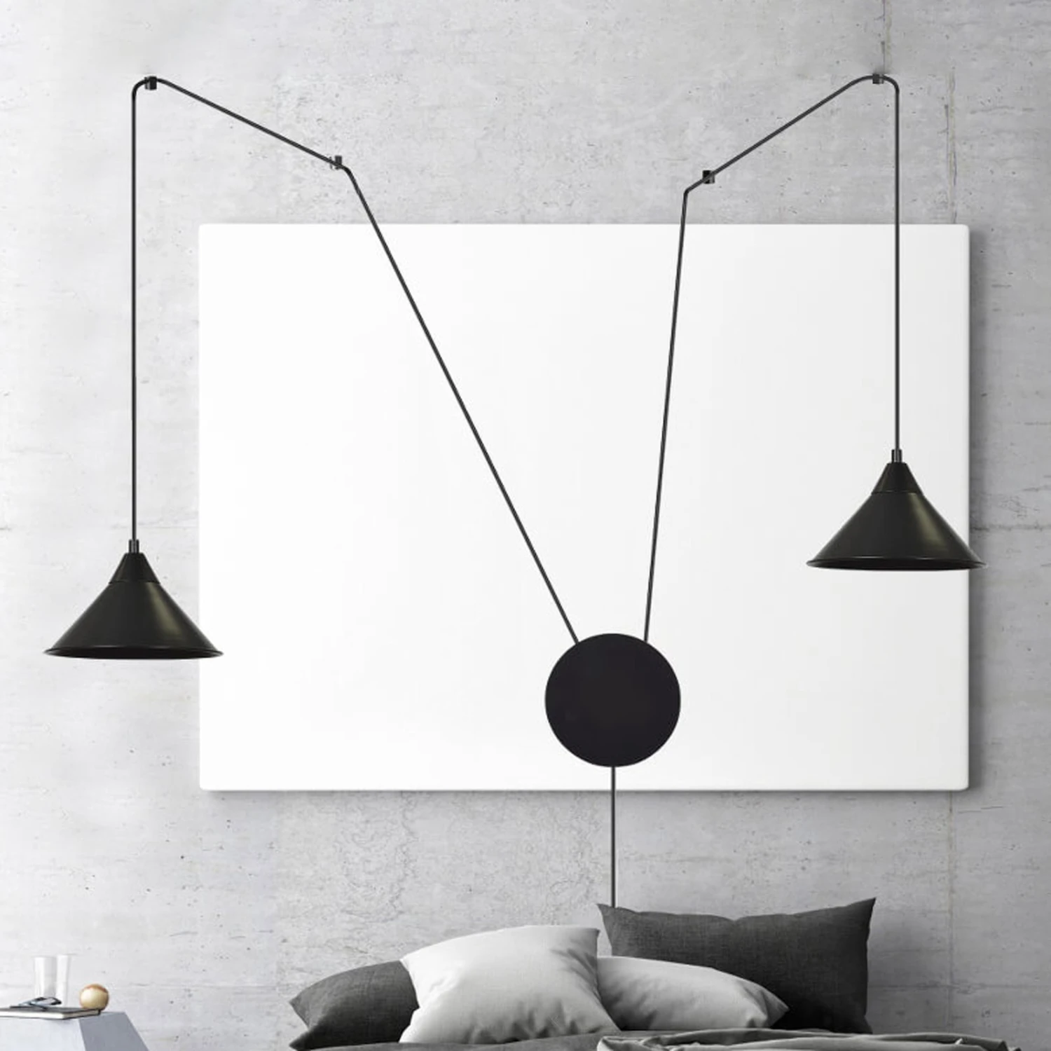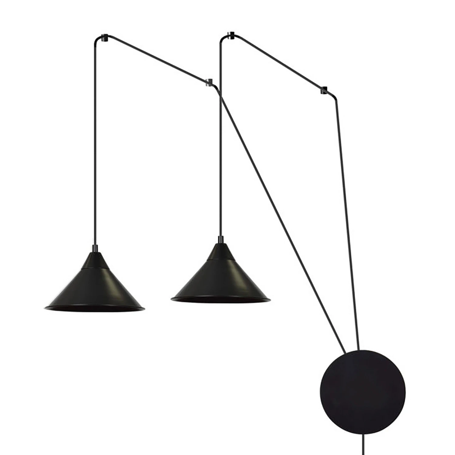 Bei der zweiflammigen Hängeleuchte Ramo fällt zuerst die runde Halterung ins Auge. Diese kann an der Wand oder wahlweise an der Decke montiert werden. Über zwei Kabel, die mit Klammern an der Decke befestigt werden, hängen ihre kompakten Schirme ab. Diese bieten jeweils Platz für ein E27-Leuchtmittel (separat über das Zubehör erhältlich). Strom bekommt Ramo über die Steckdose und kann per Schalter am Kabel ein- und ausgeschaltet werden.