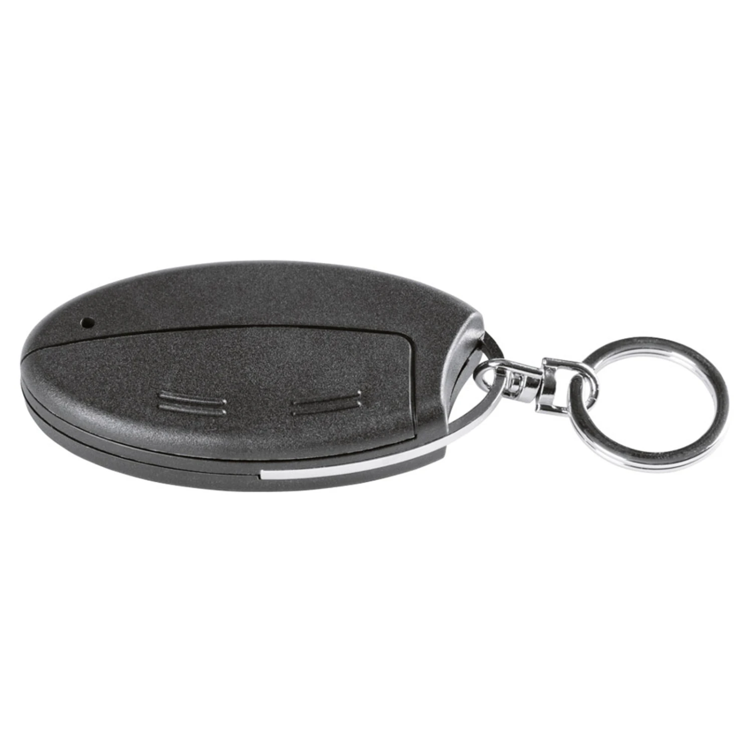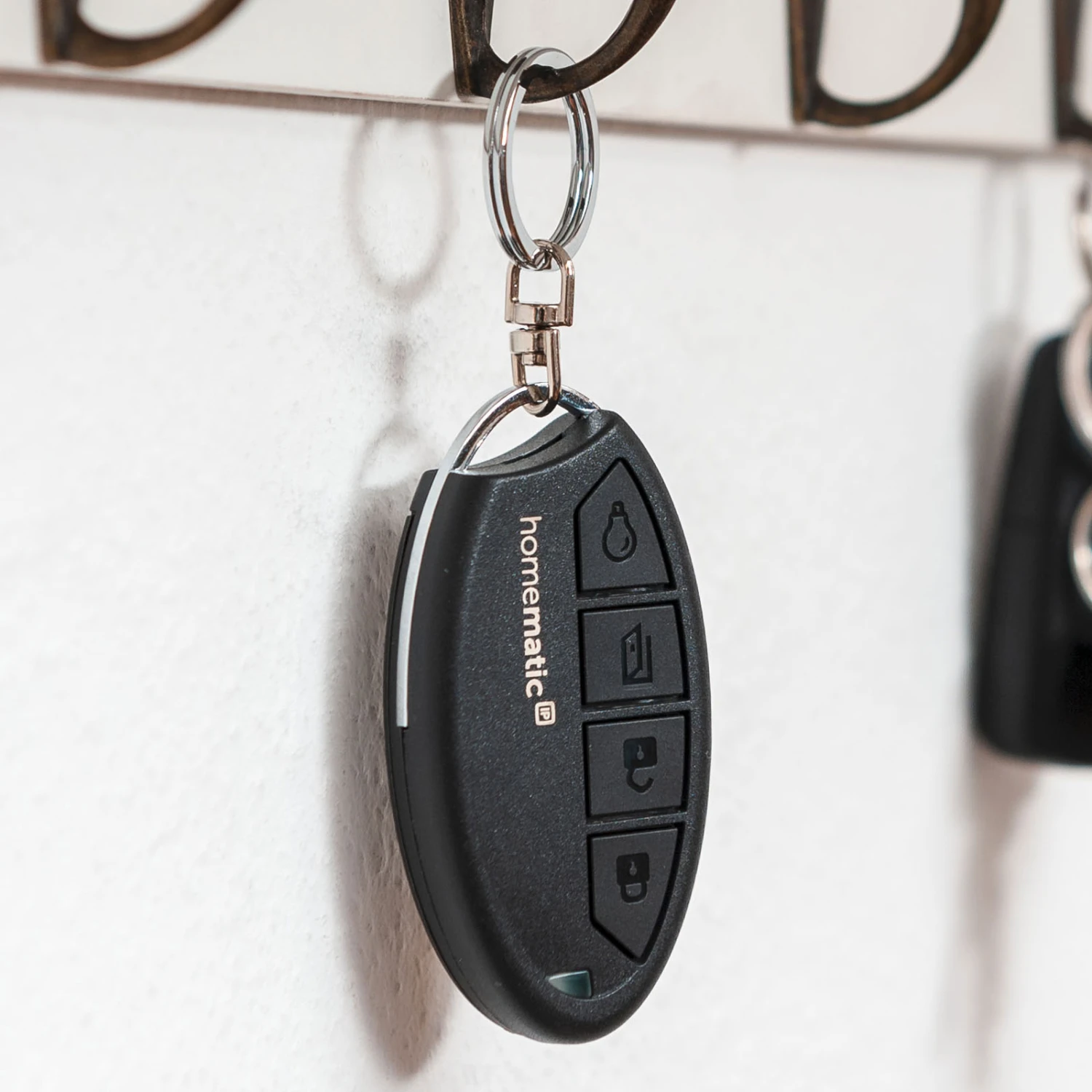 Zu Befestigung am Schlüsselbund ist die Fernbedienung mit einem Metallring ausgestattet. Bei Betätigung sorgt eine kleine Multicolor-Status-LED für eine Rückmeldung. Es stehen vier Tasten zur Verfügung: Tür verriegeln, Tür entriegeln, Tür öffnen und Licht ein- und ausschalten. Letzteres dient zur Steuerung von Lampen im Eingangsbereich, die in Homematic IP eingebunden sind.