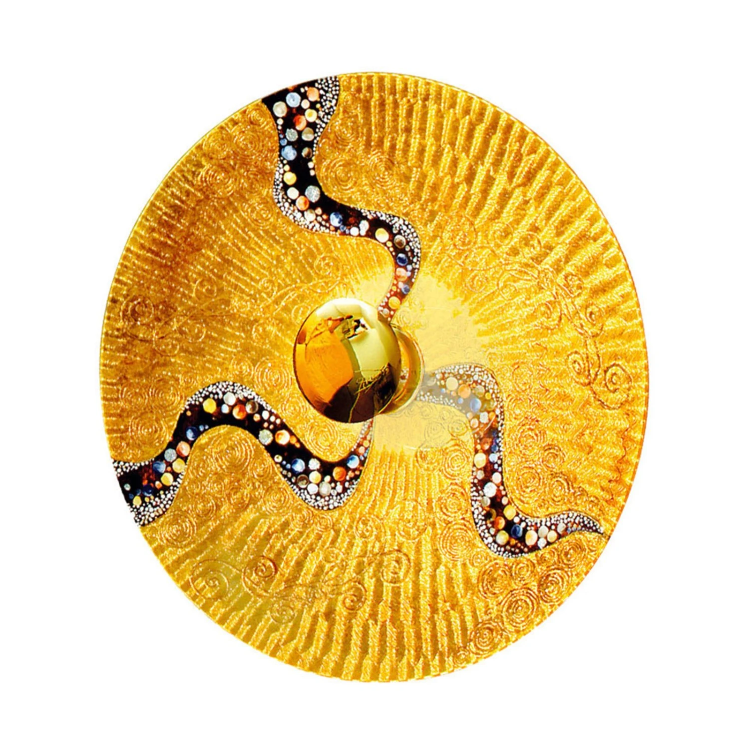 Diese Wandleuchte erfüllt jeden Wohnraum mit ihrer edlen und zugleich warmen Aura. Die Basis von Luna bildet eine runde Glasscheibe, die mit 24 kt-Blattgold überzogen ist. Die Oberfläche ist in Handarbeit mit kunstvollen Ornament-Mustern versehen. Vom Zentrum aus streben drei geschwungene Bänder nach außen; hierauf befinden sich unterschiedlich große, bunte Punkte, deren Strukturen und Farben sich nach je nach Blickwinkel und Lichteinfall zu wandeln scheinen. Die Lampe wird hinter einer runden Abdeckung eingesetzt, die zur Raumseite verspiegelt ist. Das Licht betont die Muster der Scheibe und trägt deren goldenen Ton als indirekte Beleuchtung in den Raum.