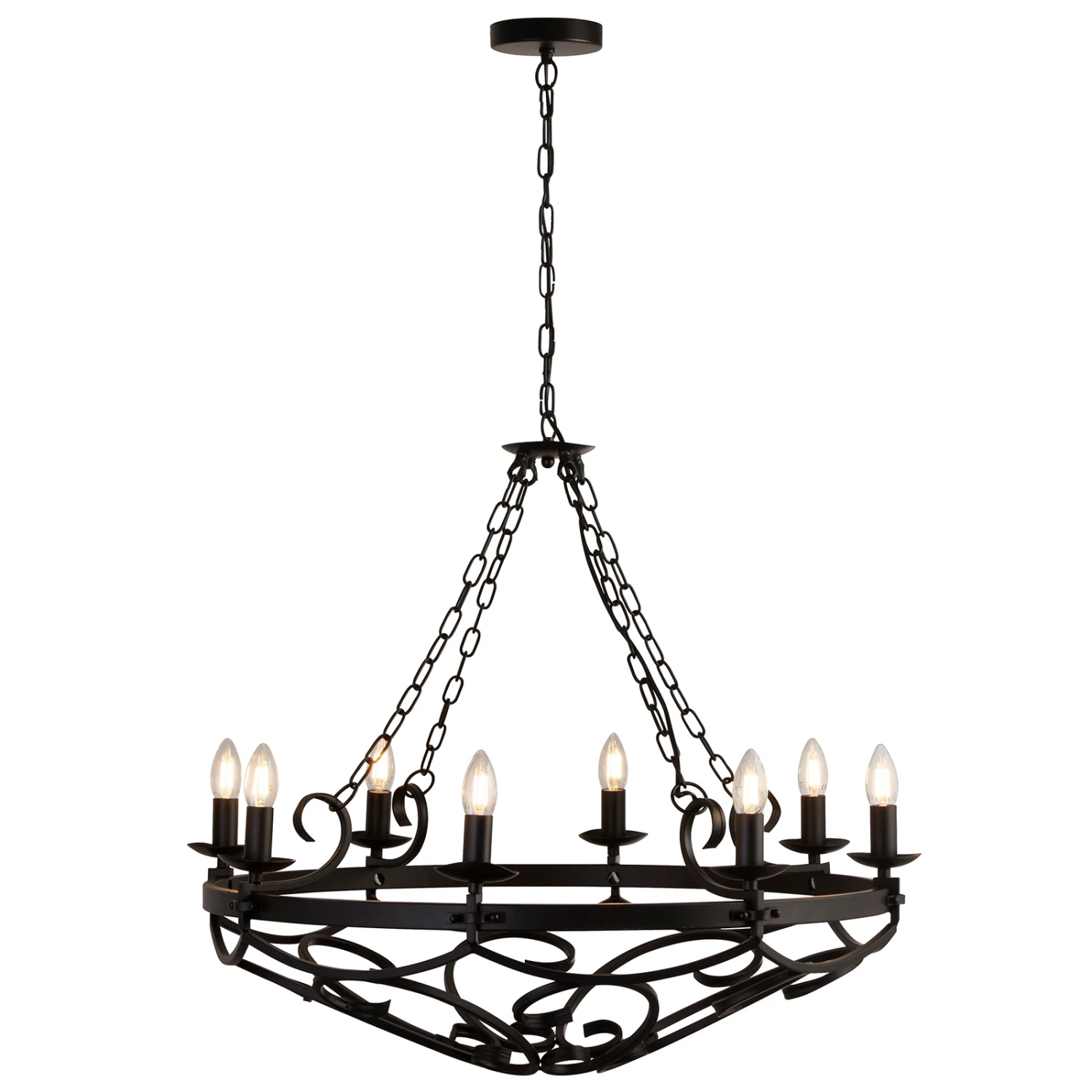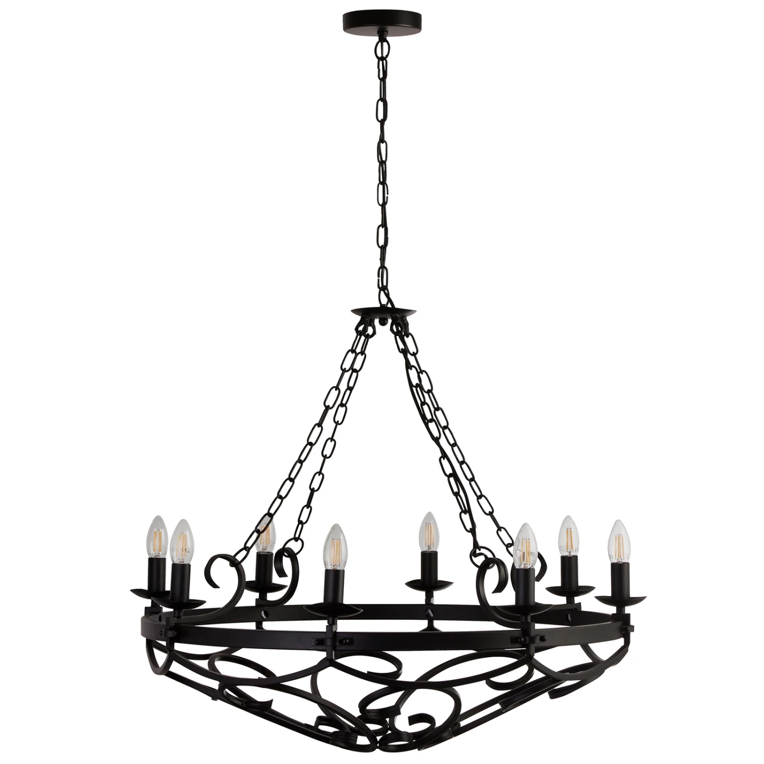 Der recht große, achtflammige Kronleuchter Cartwheel passt in viele Einrichtungsstile und erhellt auch große Räume. Der runde Kronleuchter wurde aus Stahl hergestellt und matt-schwarz lackiert. Die Verzierungen, mit denen das runde Gestell nach unten gearbeitet wurde, machen ihn zum dekorativen Blickfang mit besonderem Charakter. Die Kettenaufhängung macht den Look perfekt.