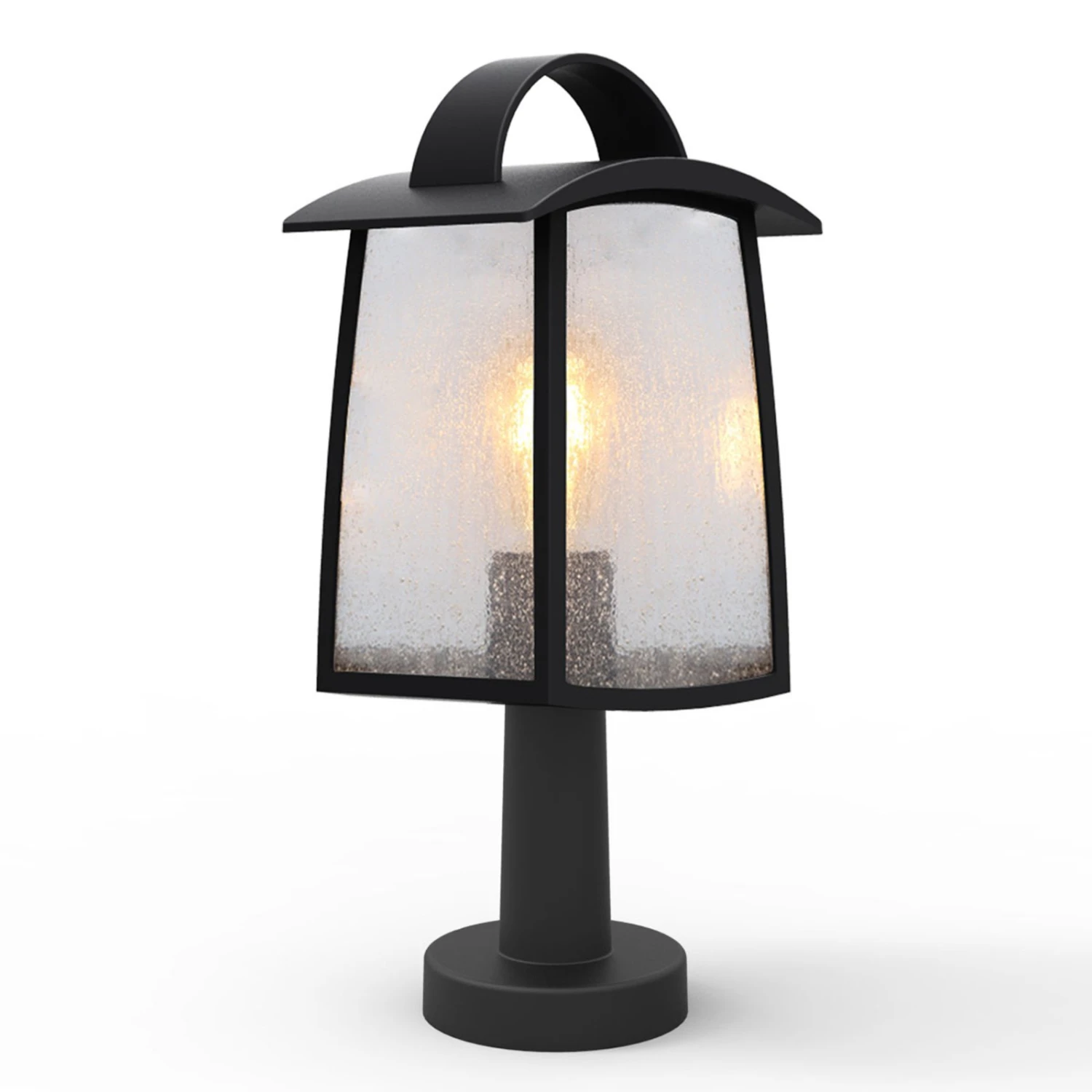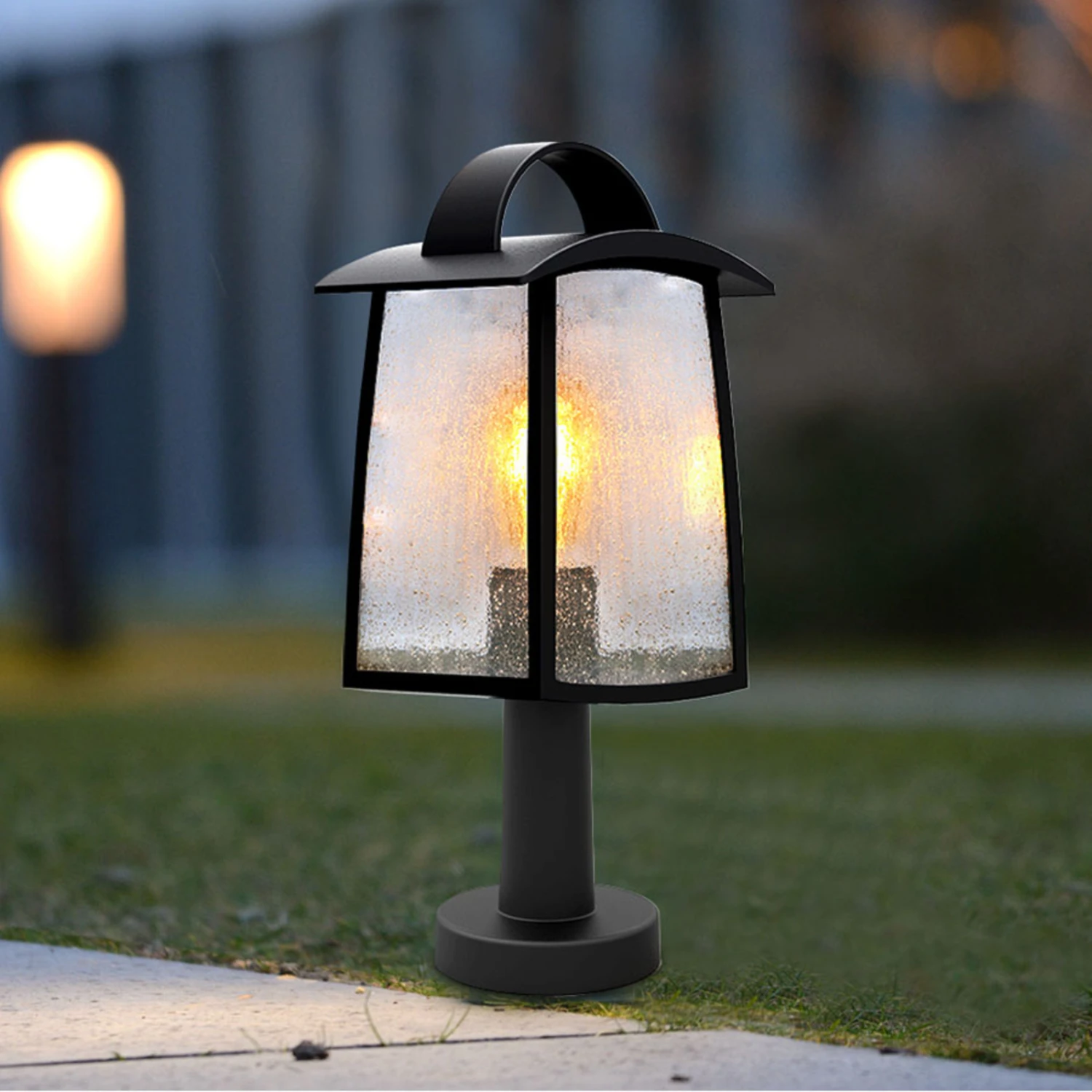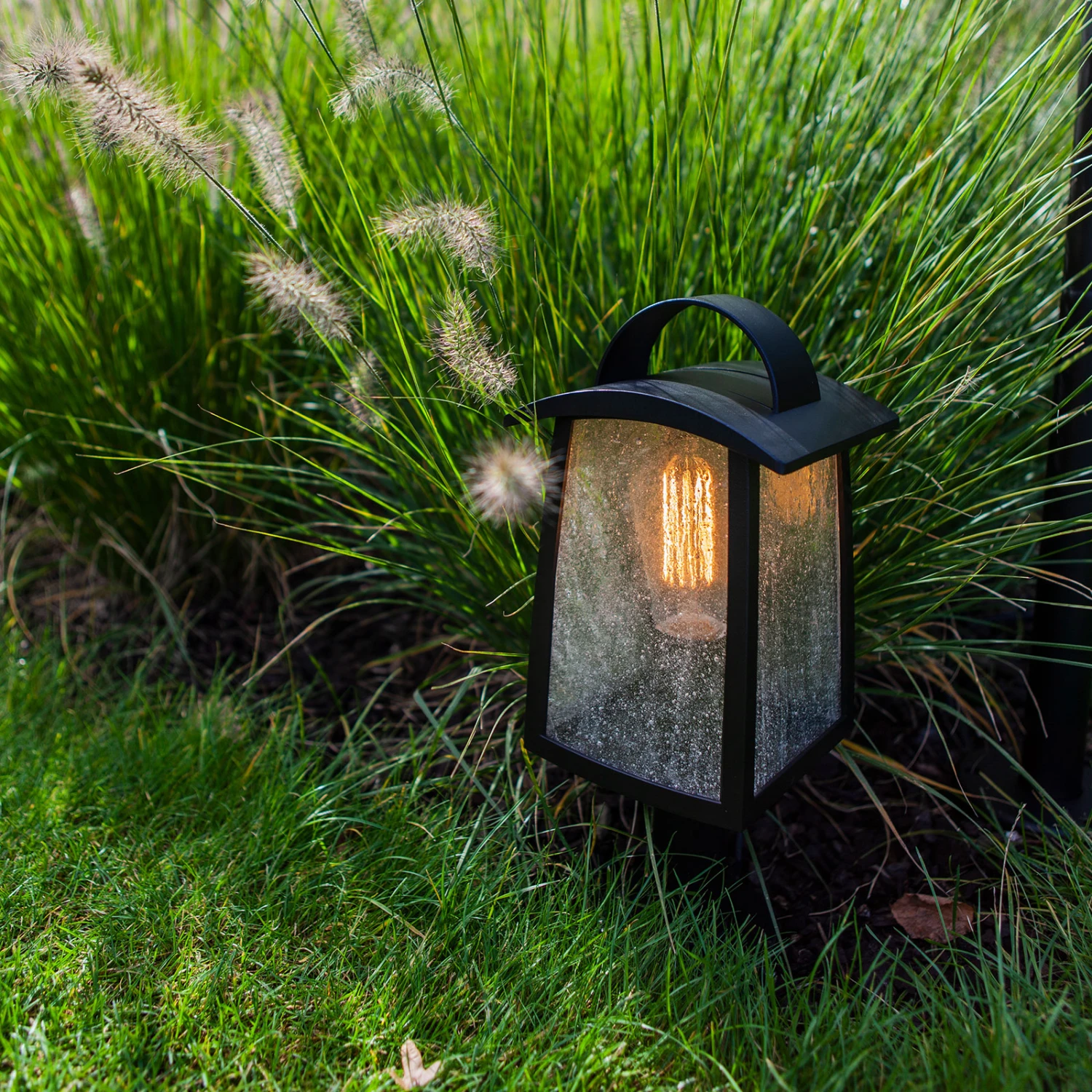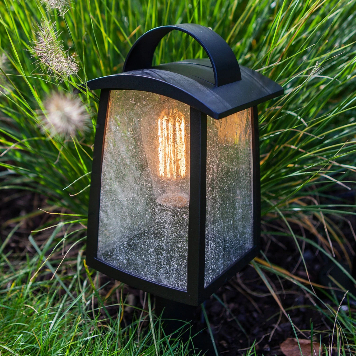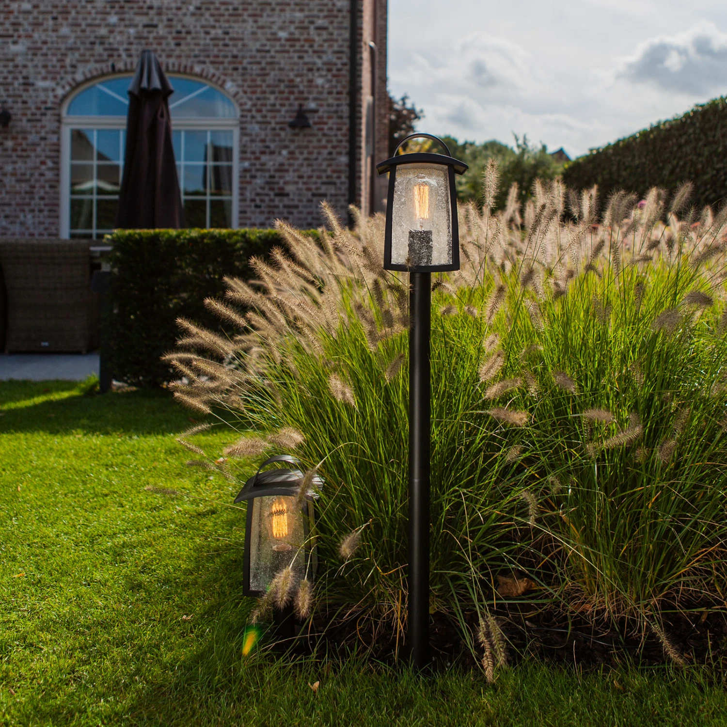 Eine schlicht gestaltete Laterne, bestehend aus einem Metallrahmen mit Bügel und Dach aus anthrazitfarbenem Aluminiumdruckguss und darin sitzenden, klaren Scheiben aus Kunststoff mit dekorativem Wassertropfen-Dekor – das ist die Sockelleuchte Kelsey. Auf Mauern oder einem Sockel angebracht, strahlt sie ihr Licht in alle Richtungen ab und gewährleistet eine helle Beleuchtung der Umgebung, nicht zuletzt wegen des klaren Schirms. Noch dekorativer wirkt die Leuchte, wenn ein Leuchtmittel in Filament-Optik gewählt wird. Moderne LED-Lampen in dieser Technik gewährleisten zudem eine energiesparende Beleuchtung und zeichnen sich durch eine sehr lange Lebensdauer aus.