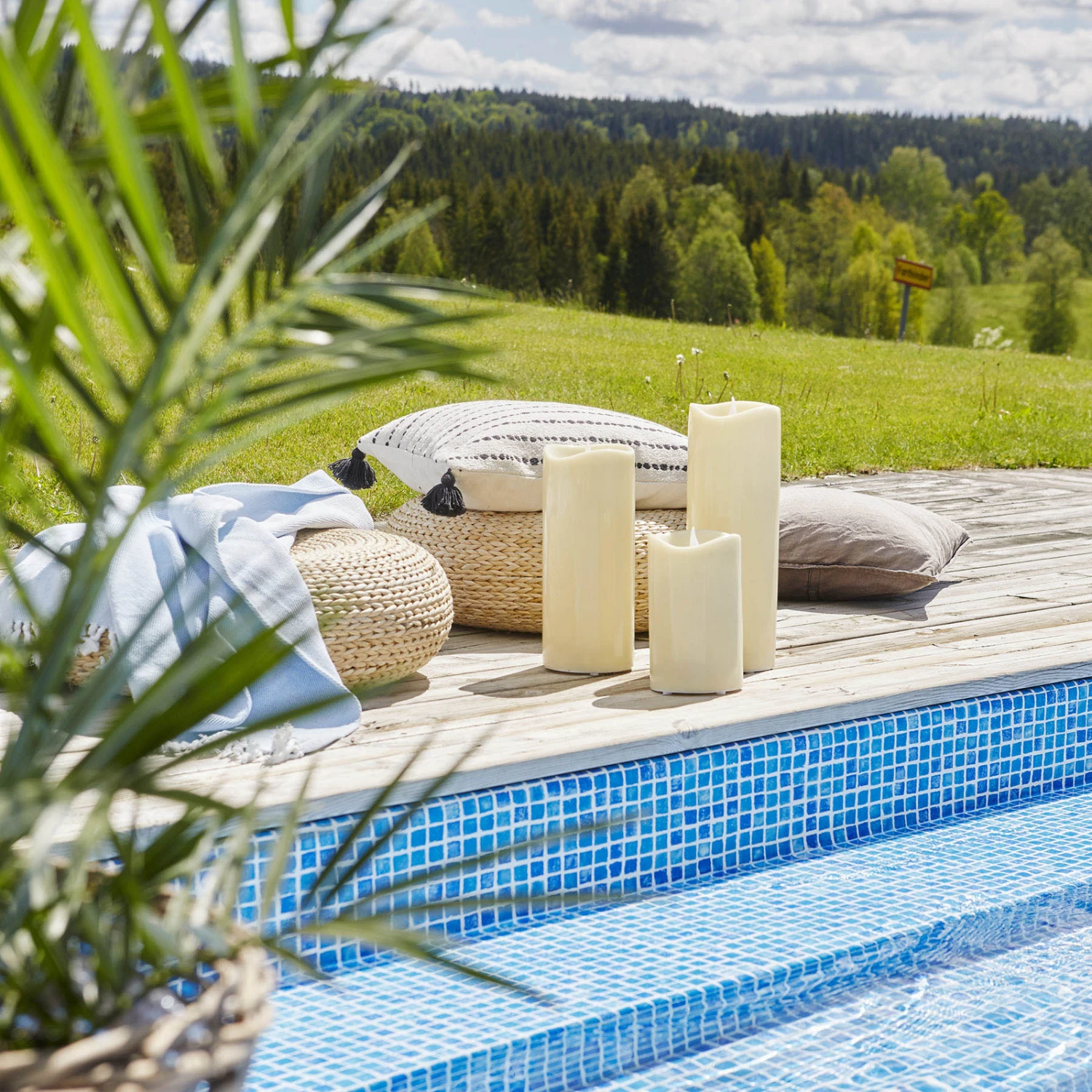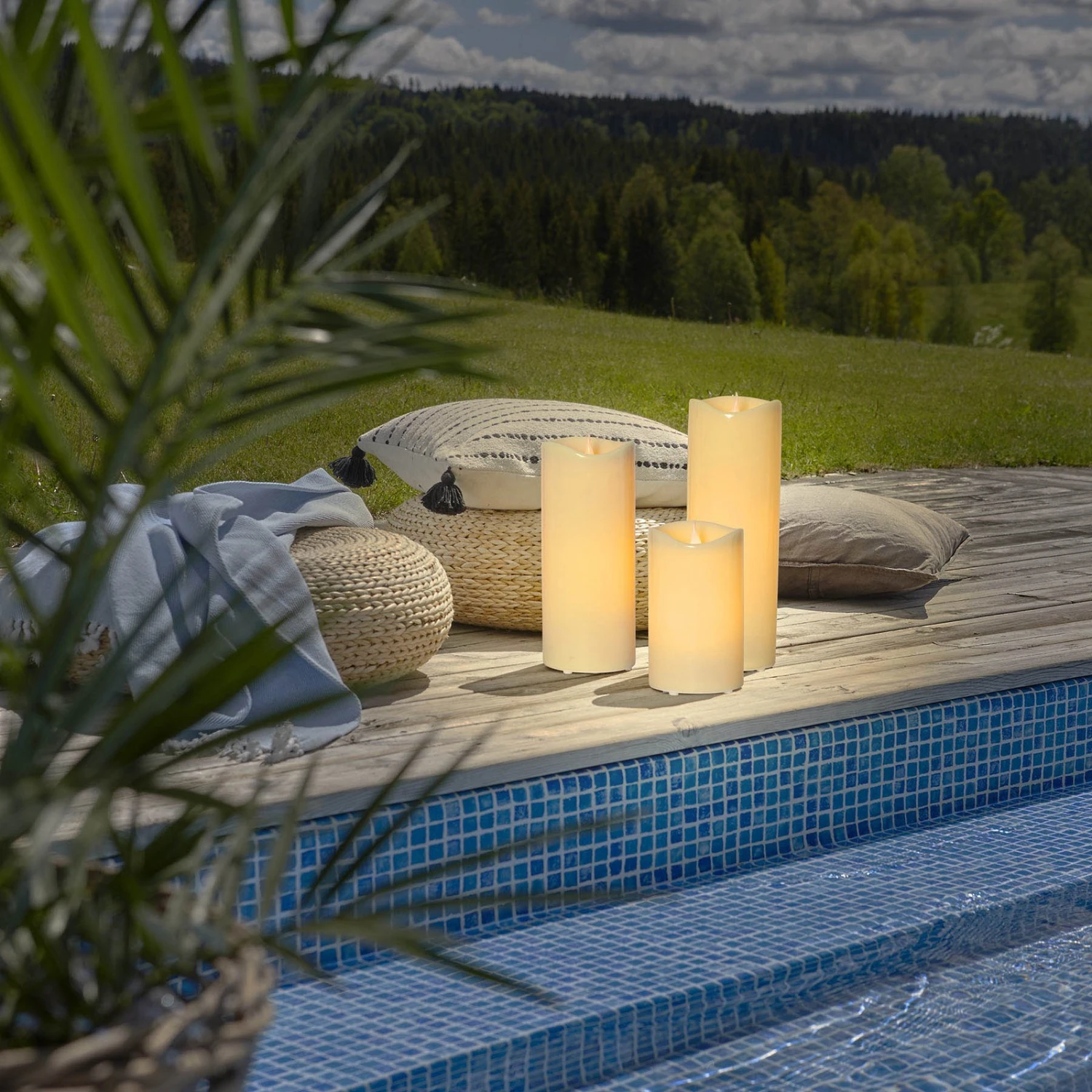 Die LED-Kerze Grande untermalt gekonnt die Abendstunden auf dem Balkon oder der Terrasse. Die beigefarbene Kerze ist für den Außenbereich vorgesehen und kann dort absolut flexibel platziert werden. Die verbauten LEDs sorgen für warmweißes, flackerndes Licht. Dank eines integrierten Timers kann über den Schalter entweder Dauerlicht gewählt oder ein 6-Stunden-Timer aktiviert werden, der die Leuchte im Anschluss für 18 Stunden ausschaltet und danach wieder startet. Natürlich kann die Kerze über den Schalter auch ausgeschaltet werden. Vor allem in Kombination mit weiteren dieser Kerzen kann ein stimmungsvolles Ambiente gezaubert werden. Die Leuchte wird mit drei C-Batterien betrieben (nicht inklusive – siehe Zubehör).
