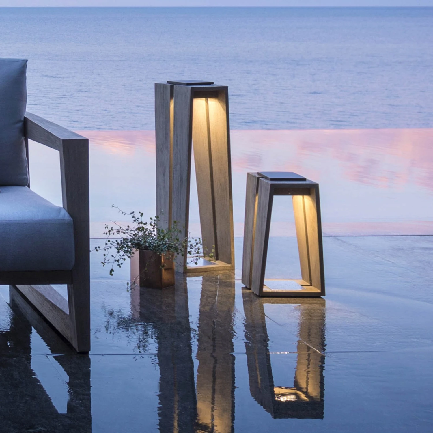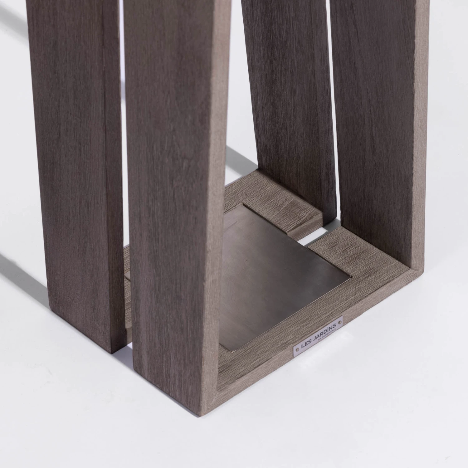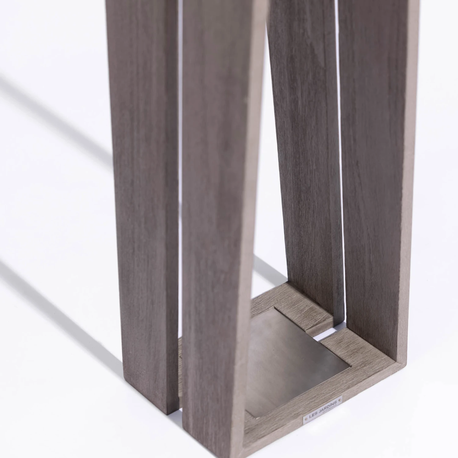 Duratek: Das Teakholz ist äußerst pflegeleicht. Es wurde zuerst zuerst kräftig gebürstet, um ein strukturiertes Finish zu erhalten. Nach einer ersten Schicht wasserfester Grundierung wurden dann fünf Schichten graues Finish aufgetragen. Dieser Prozess schützt das Holz vor Witterungseinflüssen, UV-Strahlen und verschiedenen Flecken wie Wein, Kaffee oder Öl. Die graue Farbe unterstreicht den zeitgenössischen Chic. Wartung: Nicht ölen. Mit Seifenwasser reinigen.
