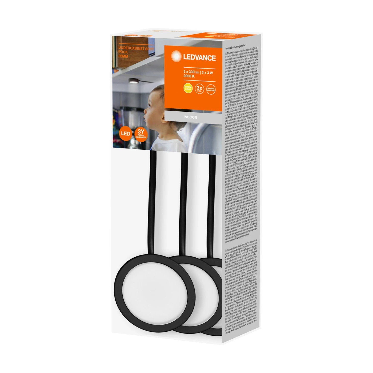Beispielsweise die Arbeitsfläche in der Küche lässt sich mit der Unterschrankleuchte Puck in breitem Winkel warmweiß ausleuchten. Die drei LED-Spots des Sets können unabhängig voneinander platziert werden und sind jeweils mit kurzer Anschlussleitung und Klemme zur festen Verdrahtung an 230 V ausgestattet. Die LED-Treiber sind in den Sports integriert. Alternativ ist auch die Einbaumontage möglich; hierbei sind eine Öffnung von Ø 6 cm, eine Wandstärke des Möbels von 0,3 bis 2 cm und eine Hohlraumtiefe von > 3 cm erforderlich.
