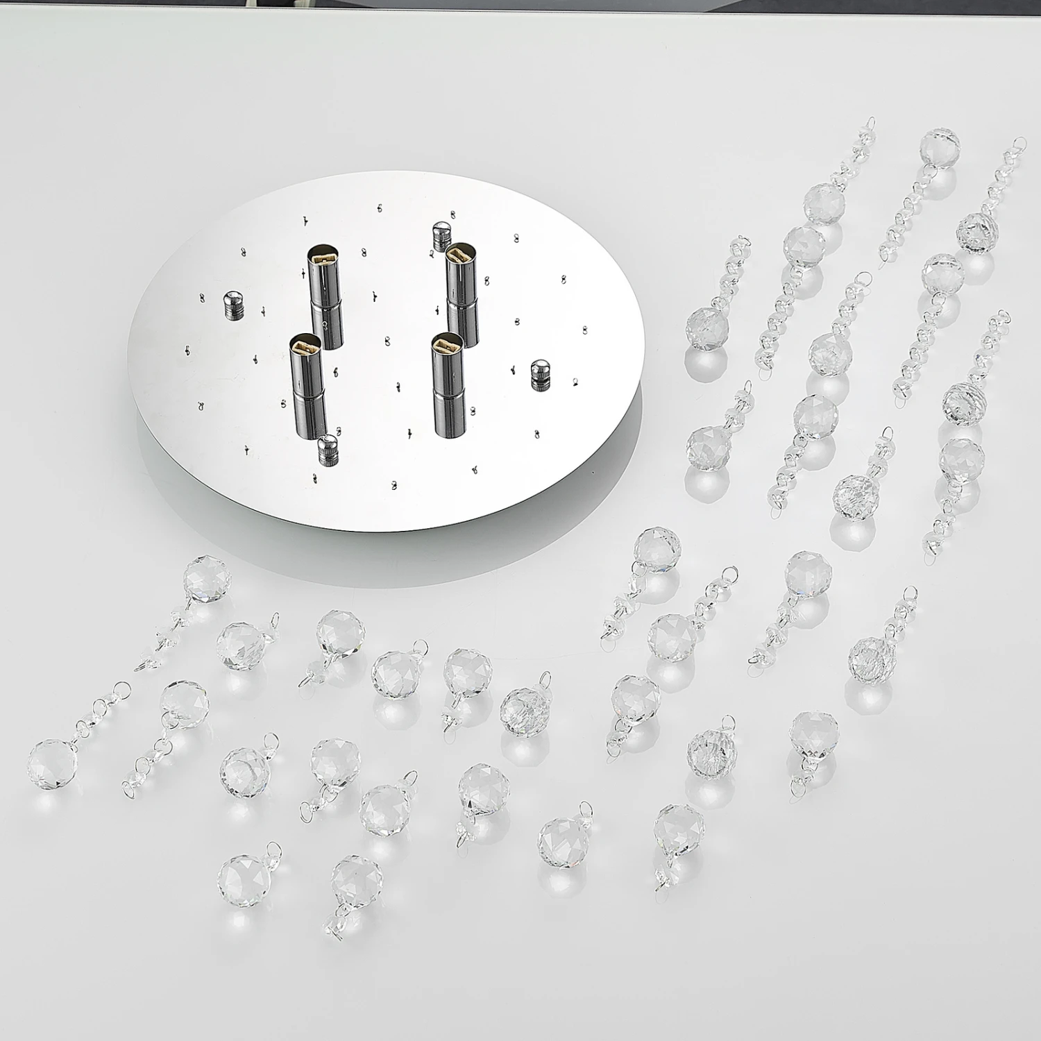 Die Deckenlampe Antonino liefert ein edles und erhobenes Ambiente. An ihrem chromfarbenen, aus Stahl hergestellten Gestell hängen Kristallketten, welche die einzusetzenden Leuchtmittel umspielen. Es können vier G9-Leuchtmittel eingesetzt werden, deren Licht durch die Ecken und Kanten des Kristalls gebündelt bzw. geteilt werden und somit ein feines Lichtspiel generieren. Aber auch ausgeschaltet macht die Leuchte durch ihre funkelnden Kristallelemente einen begehrenswerten Eindruck. Das luxuriöse Design der Deckenleuchte Antonino schenkt jedem Raum ein edles Akzent und eignet sich hervorragend für das Wohn- oder Esszimmer. Ihr kostbares und funkelndes Aussehen versprüht eine elegante Aura im Raum und verwandelt die Inneneinrichtung in etwas ganz Besonderes.