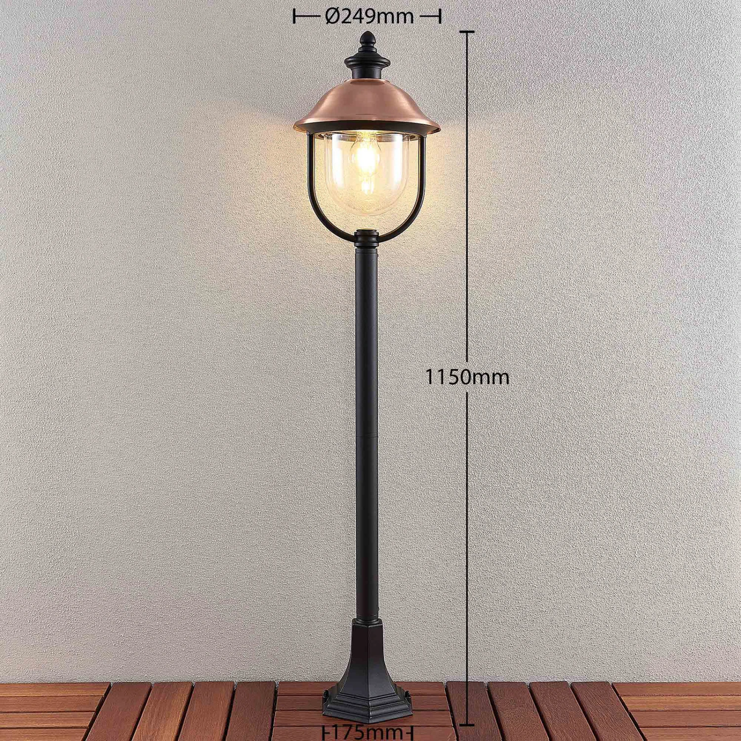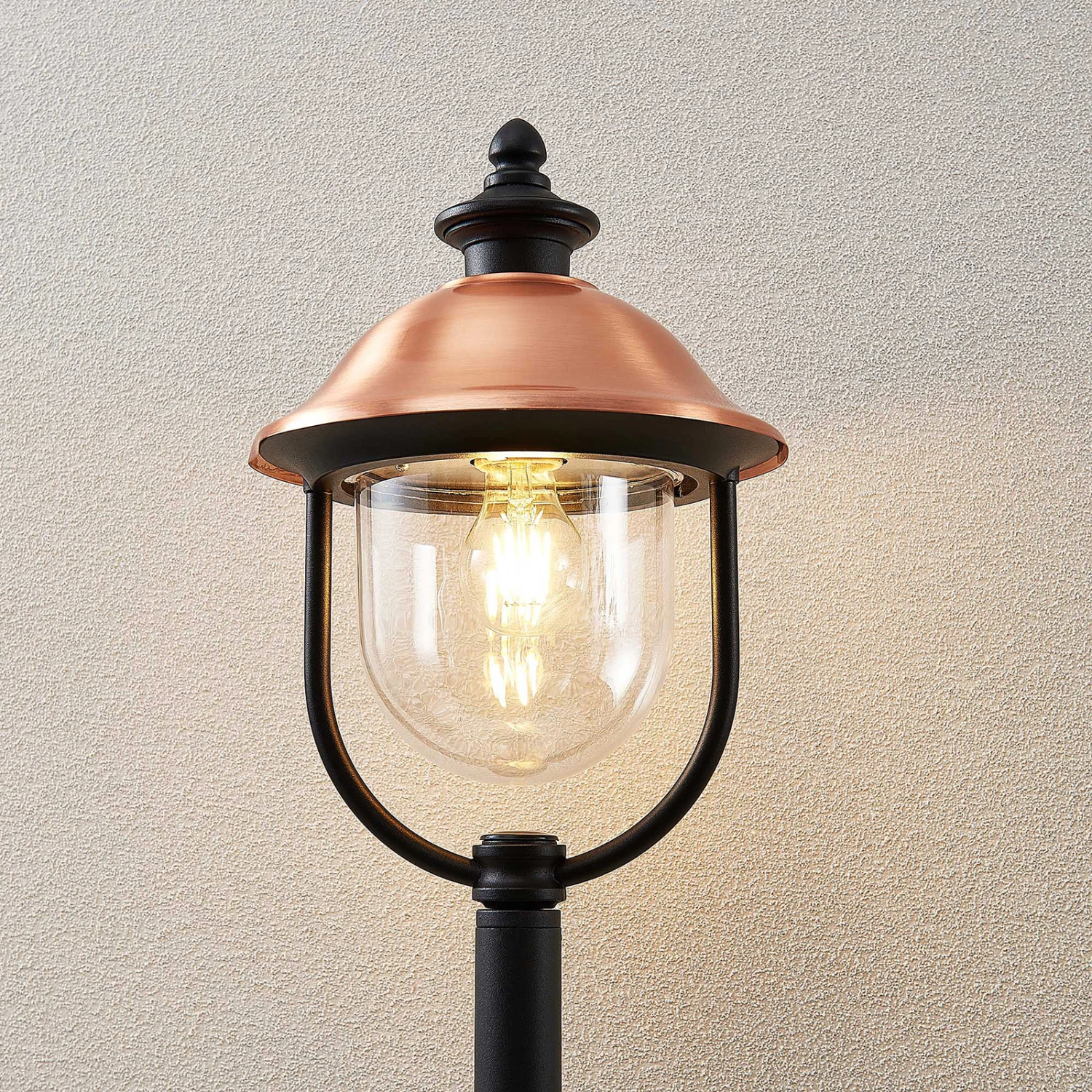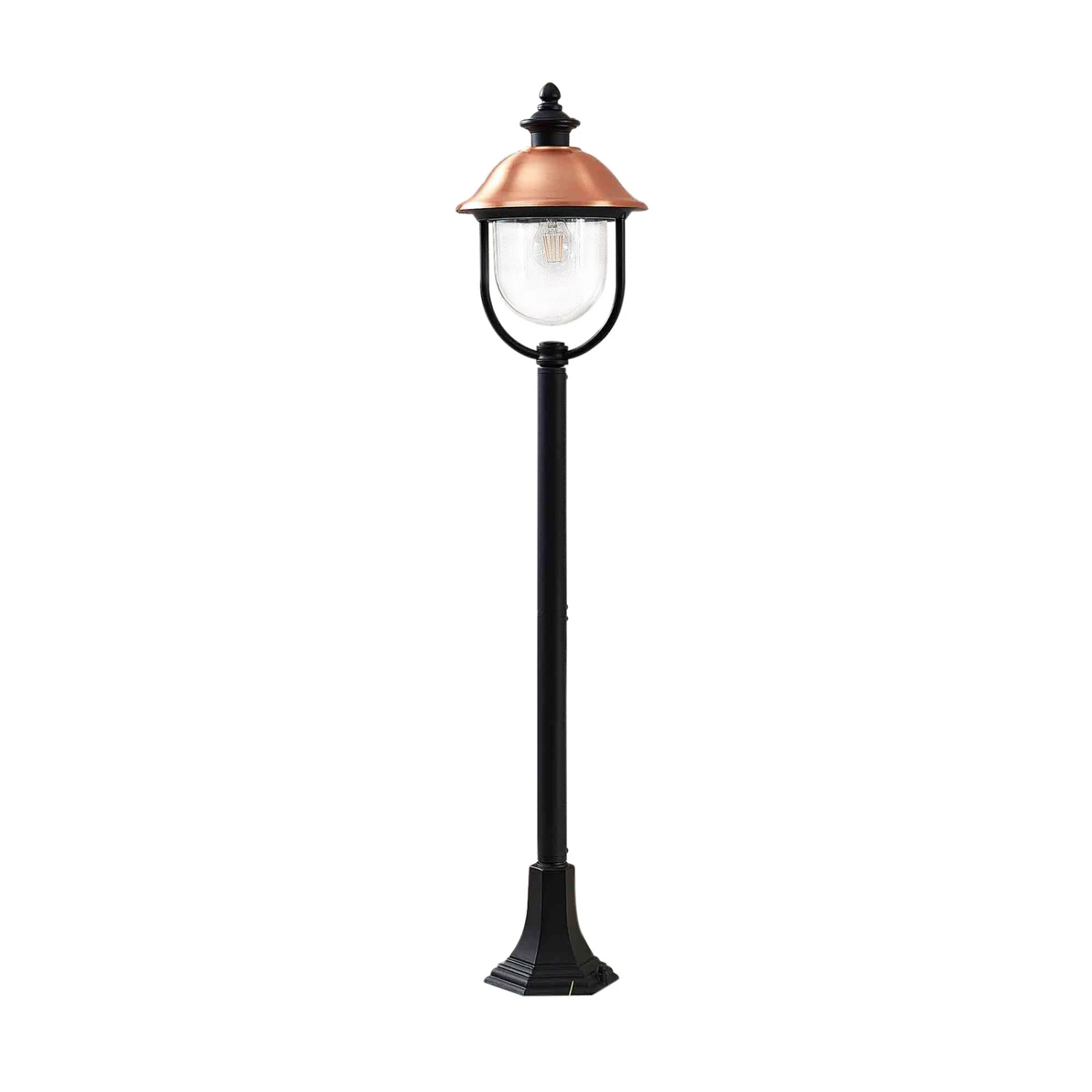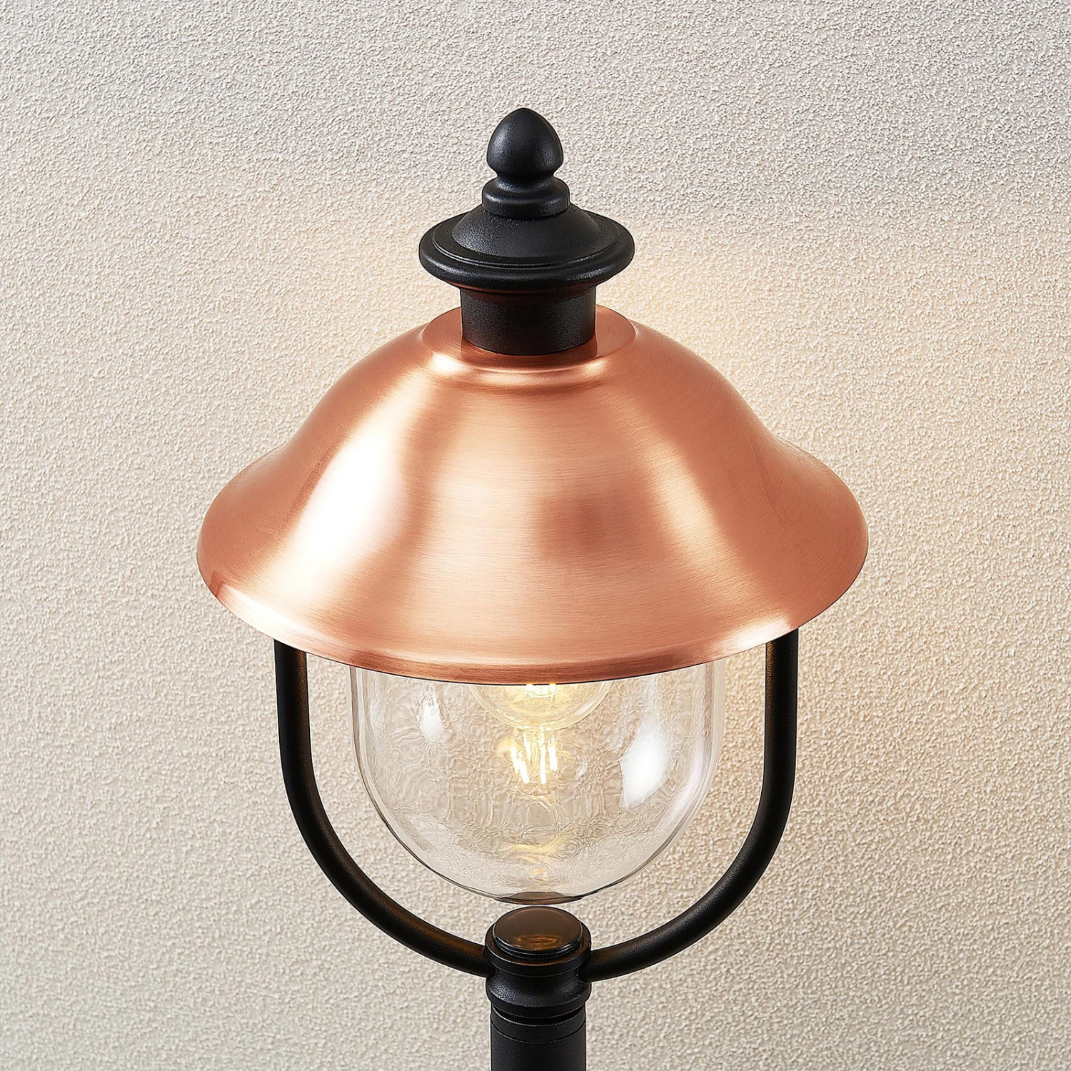Die formschöne Wegeleuchte Clint ist mit mit einem Lampenschirm mit Kupferdach ausgestattet. Leicht laternenförmig mutet die Form an, die einen transparenten Schirm um die E27-Fassung besitzt. Da hier das Leuchtmittel gut zu erkennen ist, bietet sich als Leuchtmittel für die Wegeleuchte Clint eine dekorative Filament- oder Retrofit-Lampe an. Diese unterstreicht den Vintage-Charakter und komplettiert das gelungene Design.