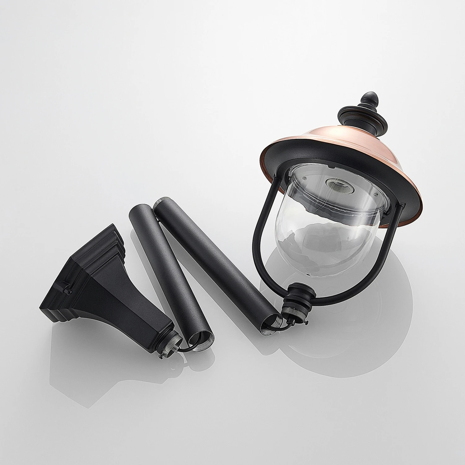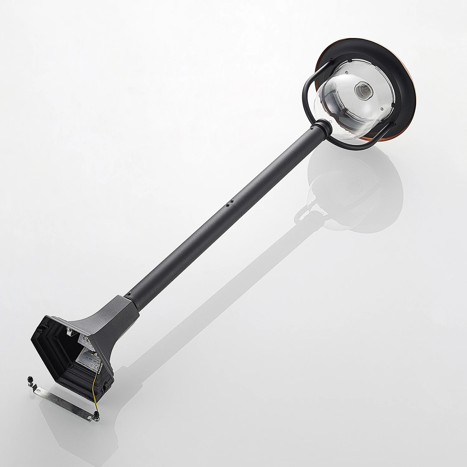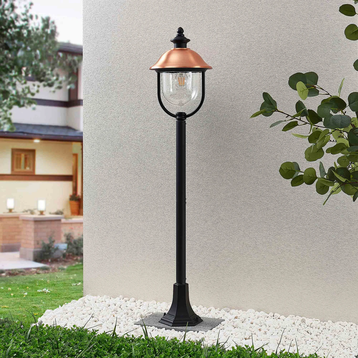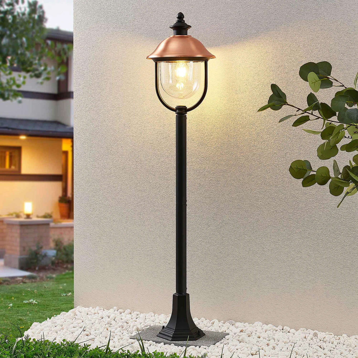 Die formschöne Wegeleuchte Clint ist mit mit einem Lampenschirm mit Kupferdach ausgestattet. Leicht laternenförmig mutet die Form an, die einen transparenten Schirm um die E27-Fassung besitzt. Da hier das Leuchtmittel gut zu erkennen ist, bietet sich als Leuchtmittel für die Wegeleuchte Clint eine dekorative Filament- oder Retrofit-Lampe an. Diese unterstreicht den Vintage-Charakter und komplettiert das gelungene Design.