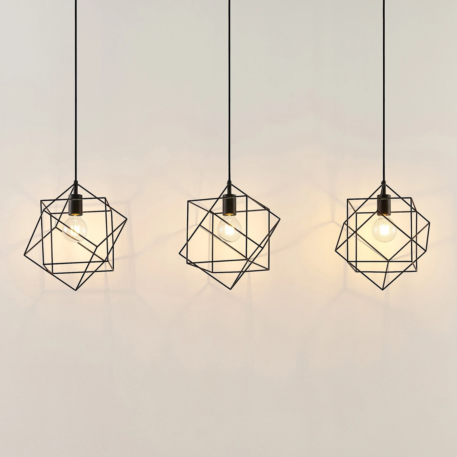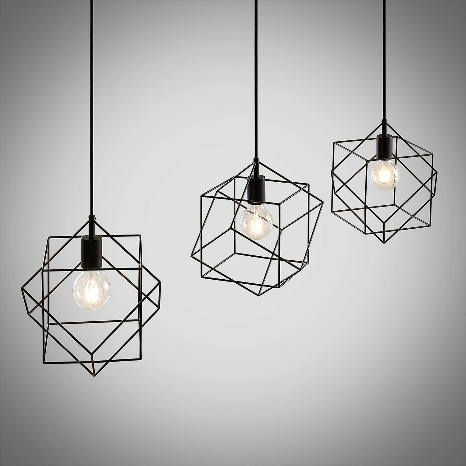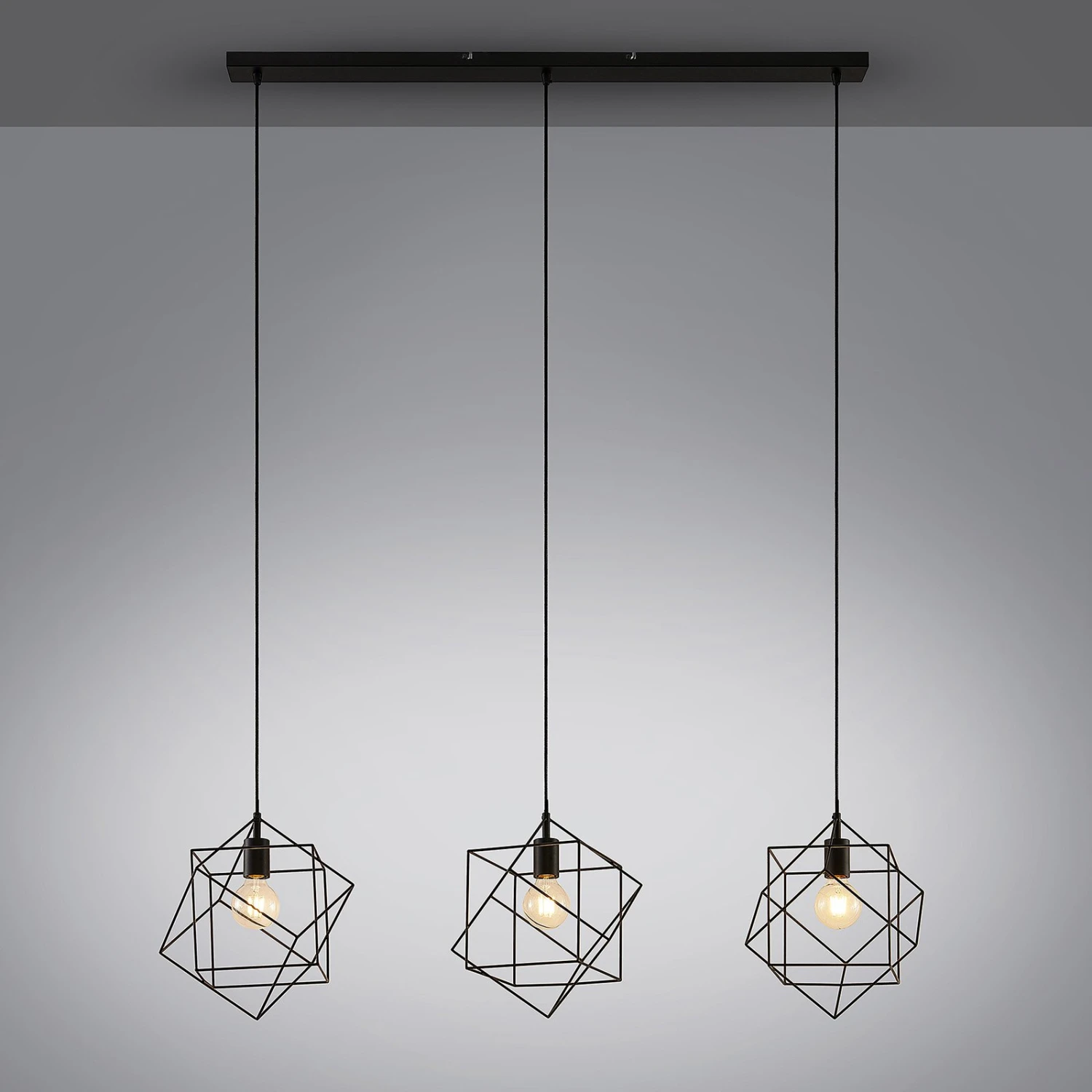 Die moderne Hängeleuchte Finnigan überzeugt durch die drei ausgefallenen Lampenschirme, bei denen offenbar je zwei würfelförmige Rahmen miteinander verbunden worden sind. Die Schirme bestehen aus schwarzen Stäben, die ineinander verschachtelt wurden. Dadurch bekommt die Leuchte eine angesagte Käfig-Optik verliehen. Diese sieht besonders in modern oder industriell eingerichteten Zimmern gut aus. Zusätzlich sorgen die Stäbe für faszinierende Lichtakzente. Das liegt an dem Zusammenspiel aus Licht und Schatten. Die Stäbe werden nämlich von hinten beleuchtet, sodass der Schatten an die Wände geworfen wird.