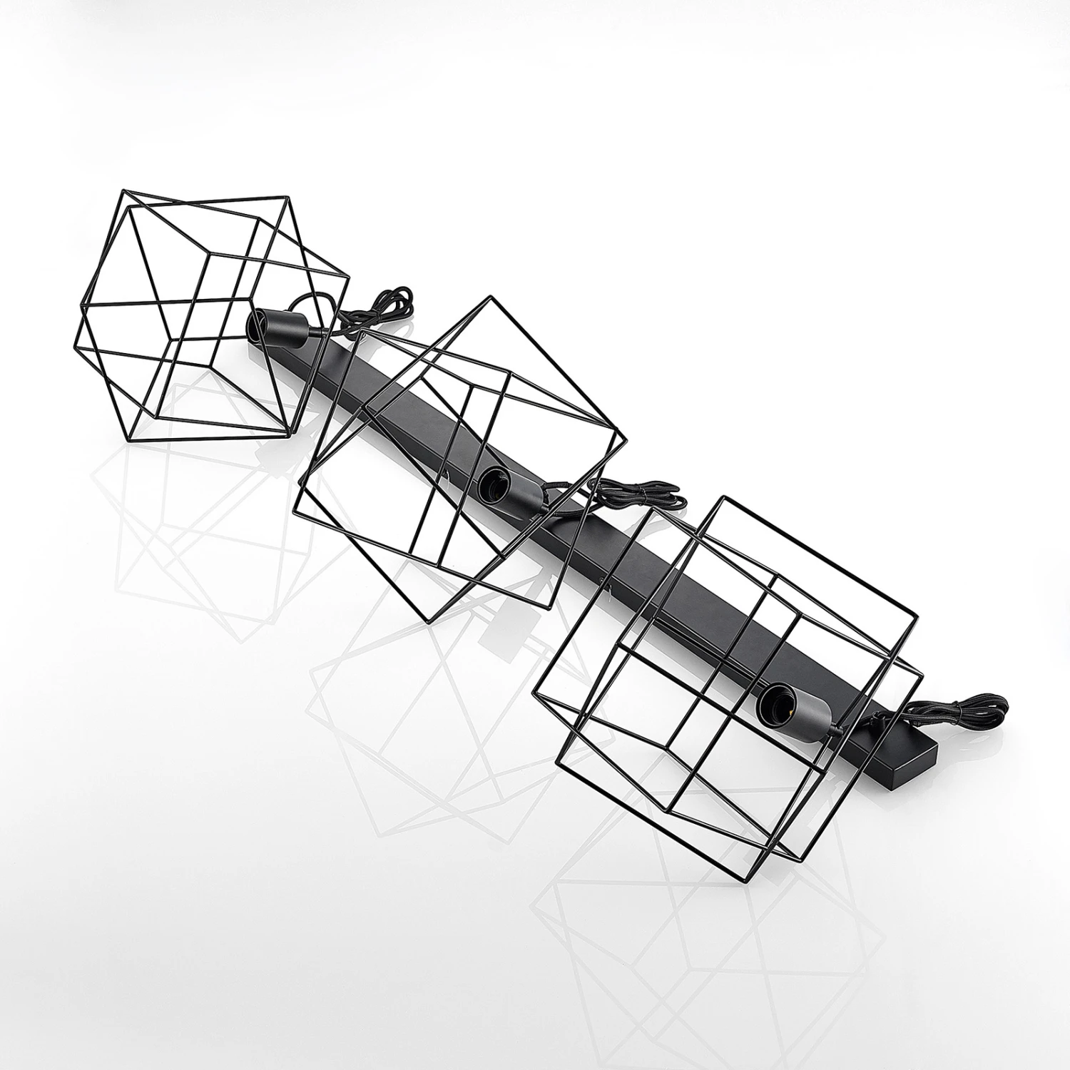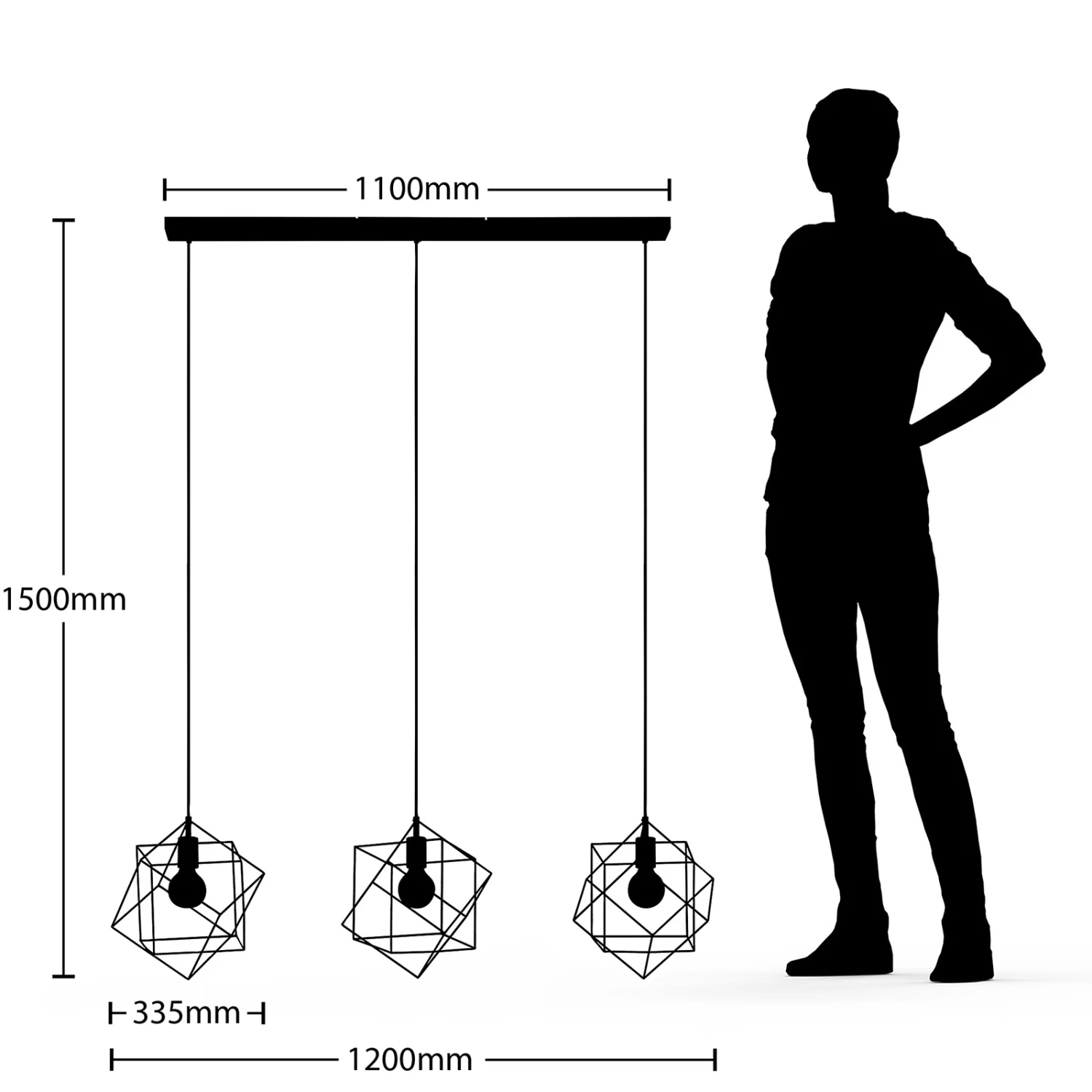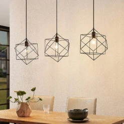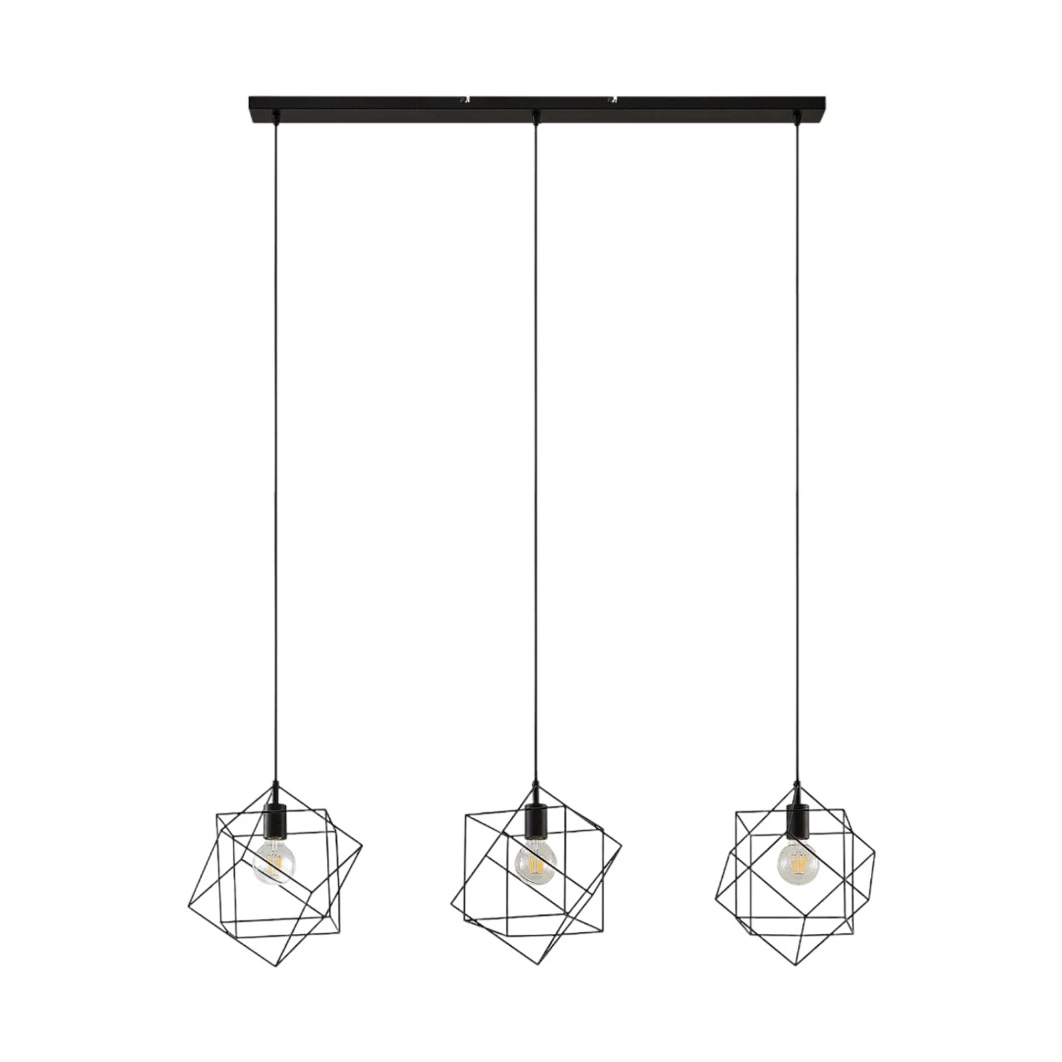 Die moderne Hängeleuchte Finnigan überzeugt durch die drei ausgefallenen Lampenschirme, bei denen offenbar je zwei würfelförmige Rahmen miteinander verbunden worden sind. Die Schirme bestehen aus schwarzen Stäben, die ineinander verschachtelt wurden. Dadurch bekommt die Leuchte eine angesagte Käfig-Optik verliehen. Diese sieht besonders in modern oder industriell eingerichteten Zimmern gut aus. Zusätzlich sorgen die Stäbe für faszinierende Lichtakzente. Das liegt an dem Zusammenspiel aus Licht und Schatten. Die Stäbe werden nämlich von hinten beleuchtet, sodass der Schatten an die Wände geworfen wird.