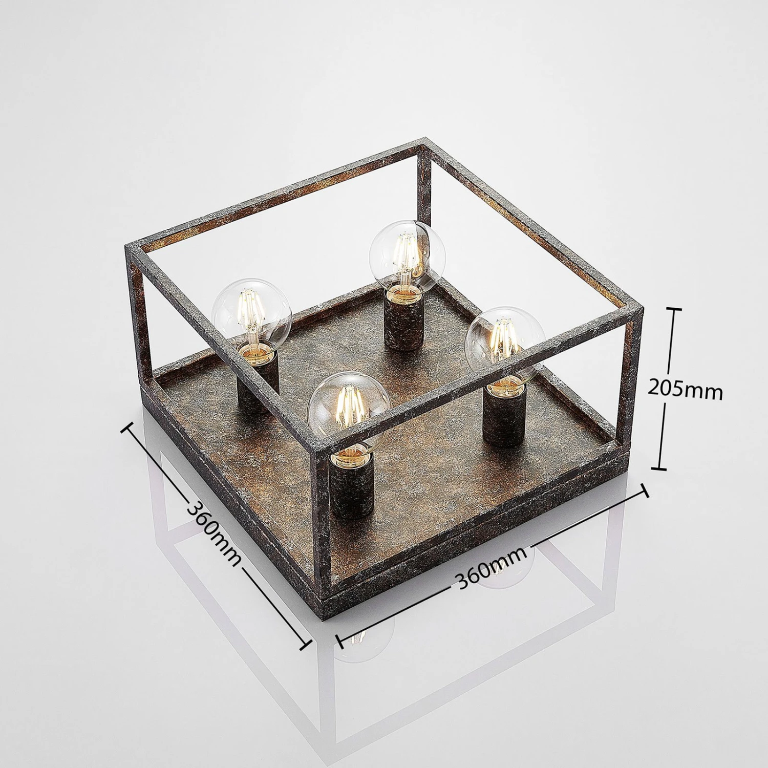 Lejus wird mit insgesamt vier E27- Lampen bestückt, die wunschgemäß ausgewählt werden können und zum Gesamtdesign passen sollten. Als sehr stilvolle Leuchtmittel präsentieren sich LED-Lampen mit Filamenttechnik oder solche in Rustikaoptik, die einen Hauch von Nostalgie entstehen lassen. In jedem Fall ist die Metalldeckenleuchte Lejus so gebaut, dass die Lampen Teil des Gesamtkonzepts und deutlich sichtbar sind. Die Leuchte selbst besteht eher aus einer Art Gerüst, das ohne Scheiben oder sonstige Einsätze auskommt. Die Oberfläche des Metalls ist in einem antik anmutenden Rostfinish gehalten, das die nostalgische Wirkung der quadratischen Deckenleuchte super unterstreicht. So ist Lejus in modernen oder rustikalen Einrichtungen ein gleichermaßen passender Lichtspender mit stets stilvollem Ausdruck.
