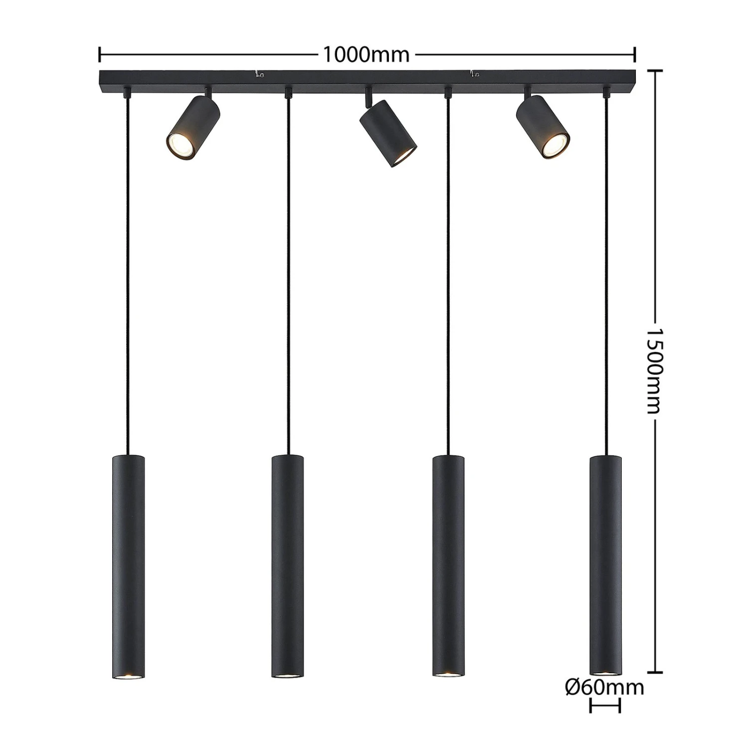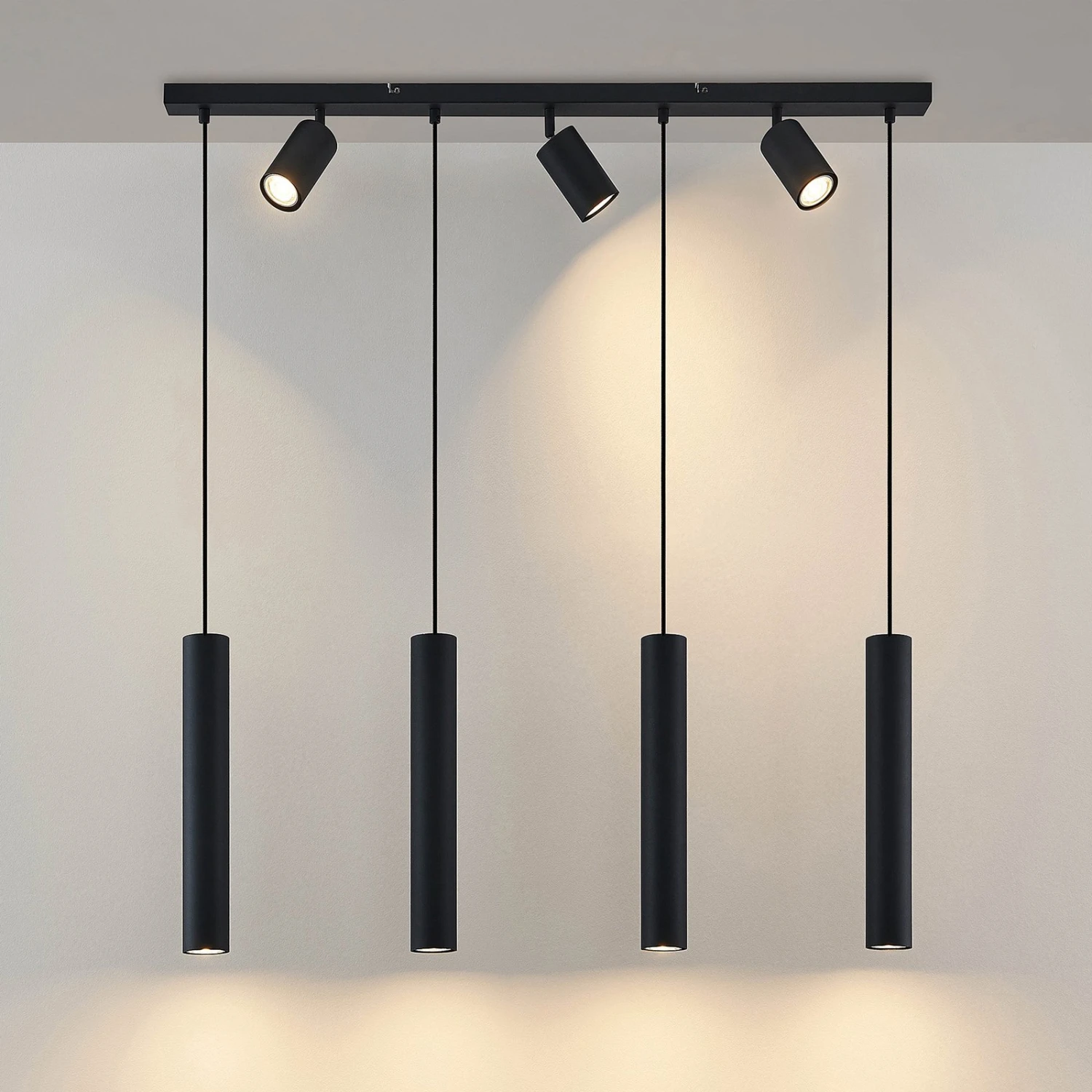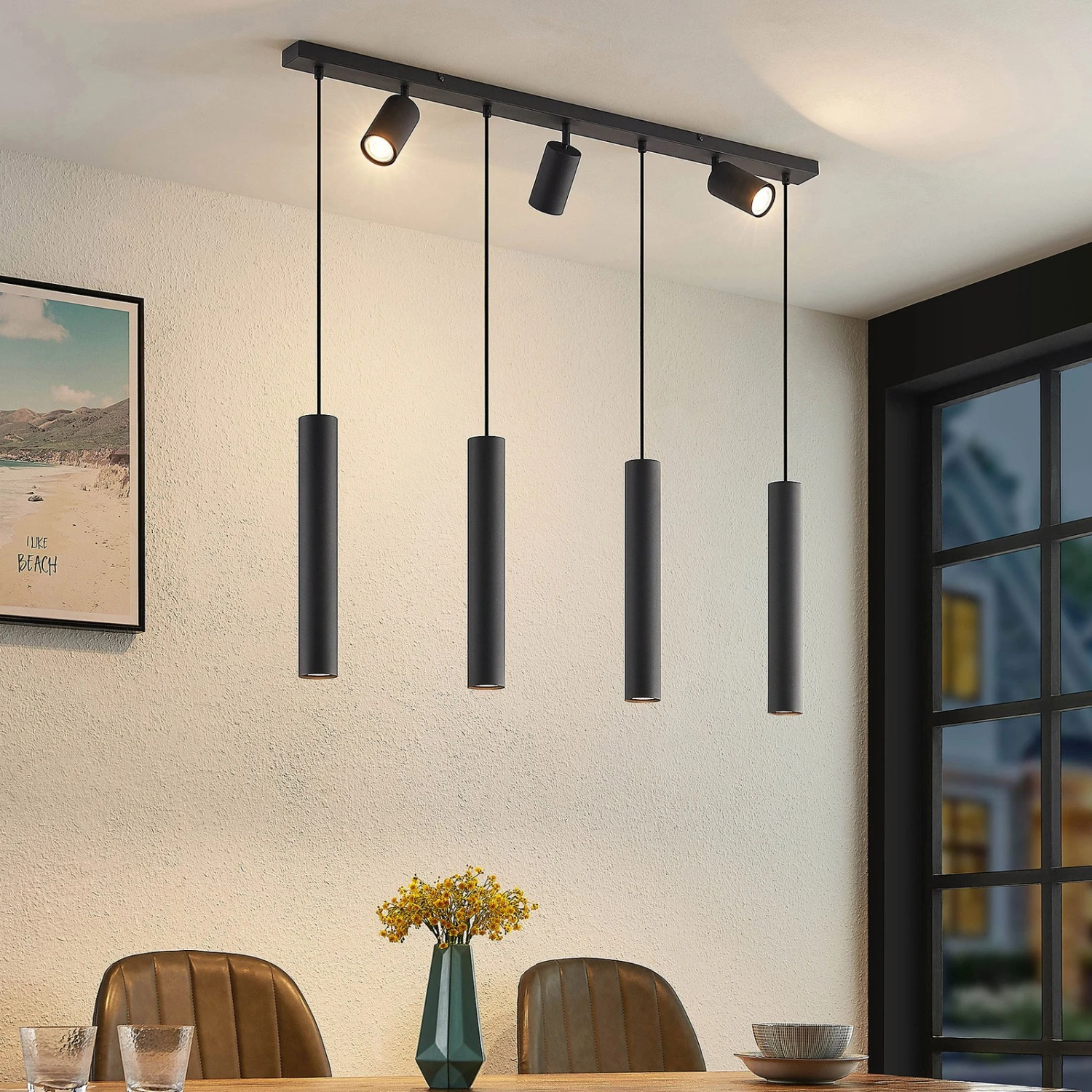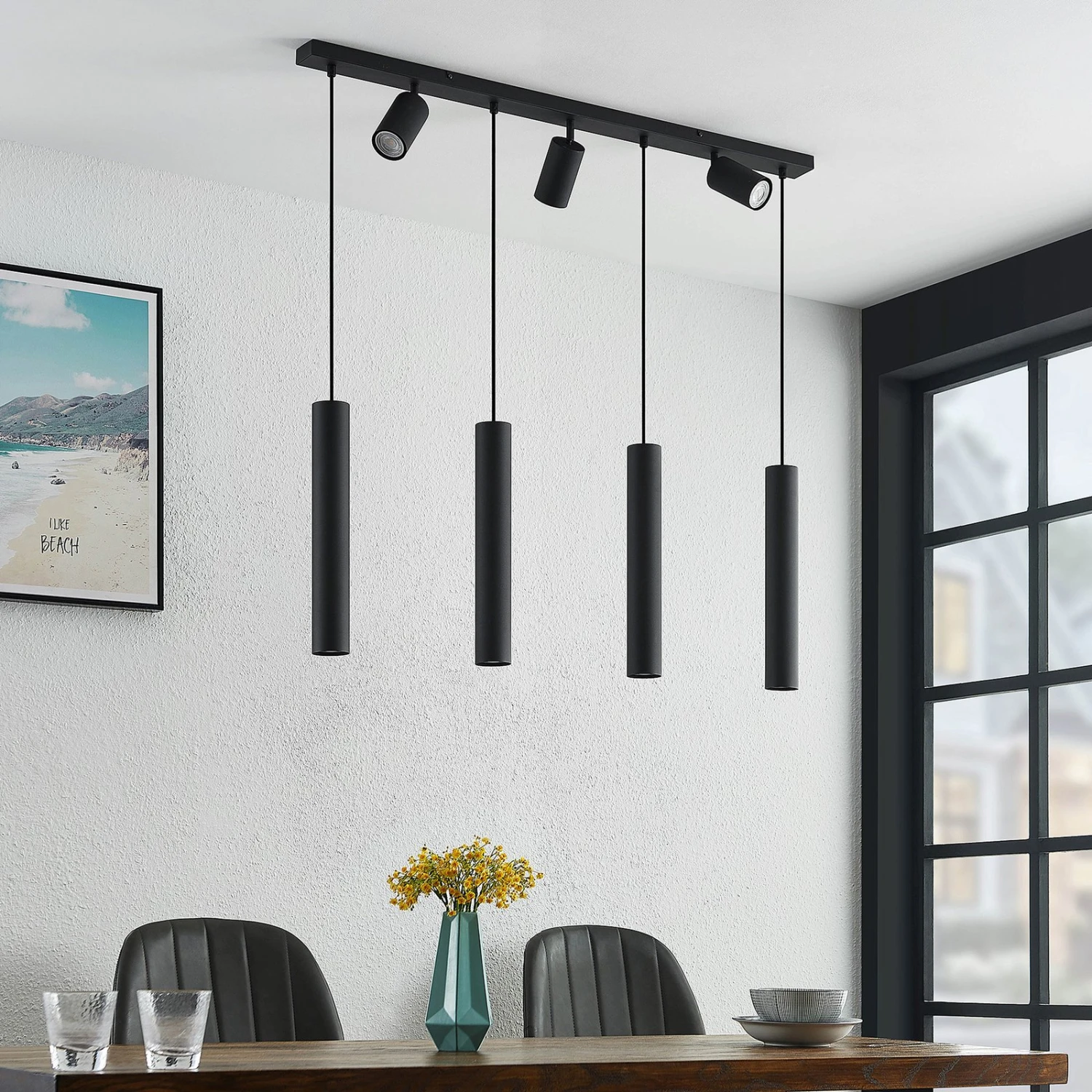 Siebenflammige Hängeleuchte Sanad aus Stahl in schlichtem Schwarz Die Hängeleuchte Sanad besteht aus einer länglichen Deckenhalterung an der ingesamt sieben Leuchtenschirme sitzen. Vier davon hängen an schmalen Aufhängungen, währenddessen drei die Abstände zwischen den Aufhängungen füllen und direkt an der Deckenhalterung angebracht sind. Im Inneren dieser Schirme können GU10-Leuchtmittel eingesetzt werden und erzeugen das passende Licht für ein Wohnzimmer. Die dezente Farbgebung in ruhigem Schwarz und das schlanke Design integrieren sich mühelos in das restliche Mobiliar und runden dieses wohlwollend ab. Die Hängeleuchte Sanad verwandelt jeden Raum in etwas ganz Besonderes und erzeugt auffällige Akzente an Wohnungsdecken.
