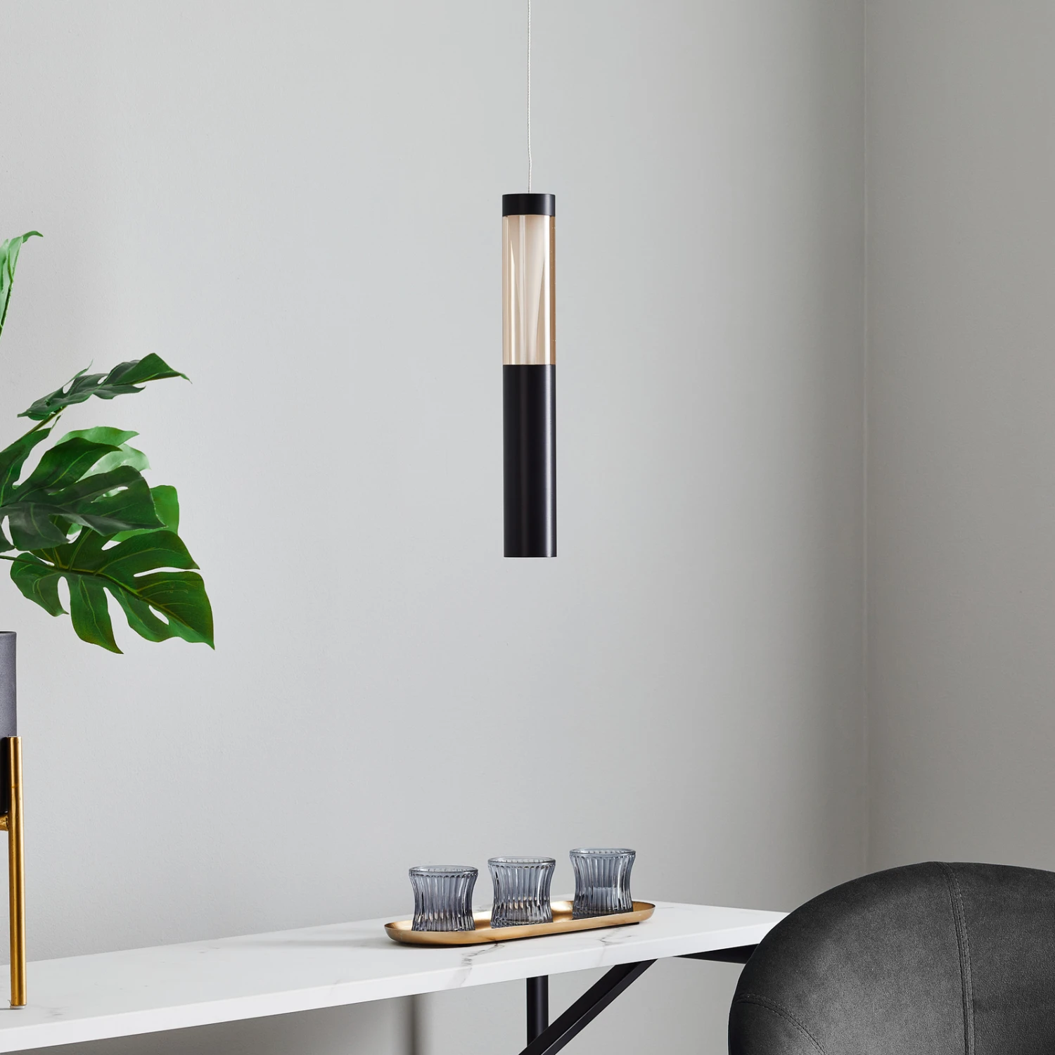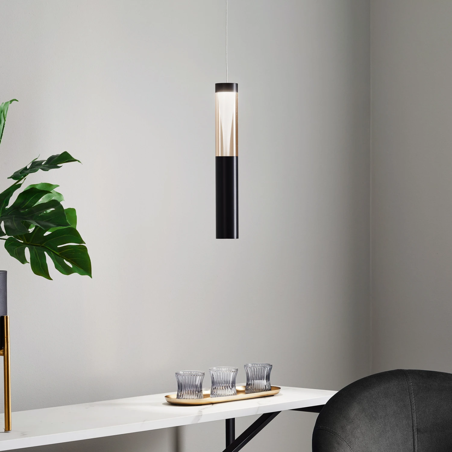 Danson ist ein extravaganter Lichtspender für den modernen Wohnbereich, der mit einer besonderen Ausstrahlung punktet und damit, dass zwei unterschiedliche Lichtquellen verbaut worden sind. Im oberen Teil des zylinderförmigen Schirms sitzt ein Kunststoffeinsatz, der außen klar und im Inneren weiß ist, so dass sich eine interessante optische Wirkung sowie ein angenehme Lichtverteilung ergibt. Nach unten wird das Licht zudem direkt abgegeben, so dass die Fläche darunter gut und hell ausgeleuchtet werden kann, wie man es sich auf einem Tisch oder einem Tresen wünscht. Das schwarze Finish wirkt edel und zeitgemäß und macht die LED-Pendellampe Danson zu einem rundum gelungenen Lichtspender!