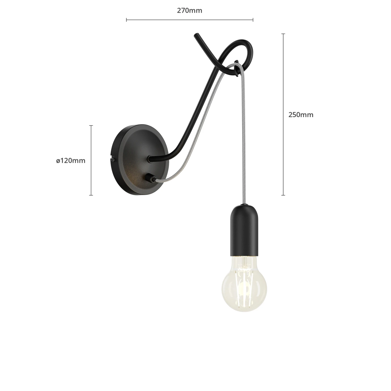 Schwarze Wandleuchte Jorna mit grauem Textilkabel in einem exklusiven Design