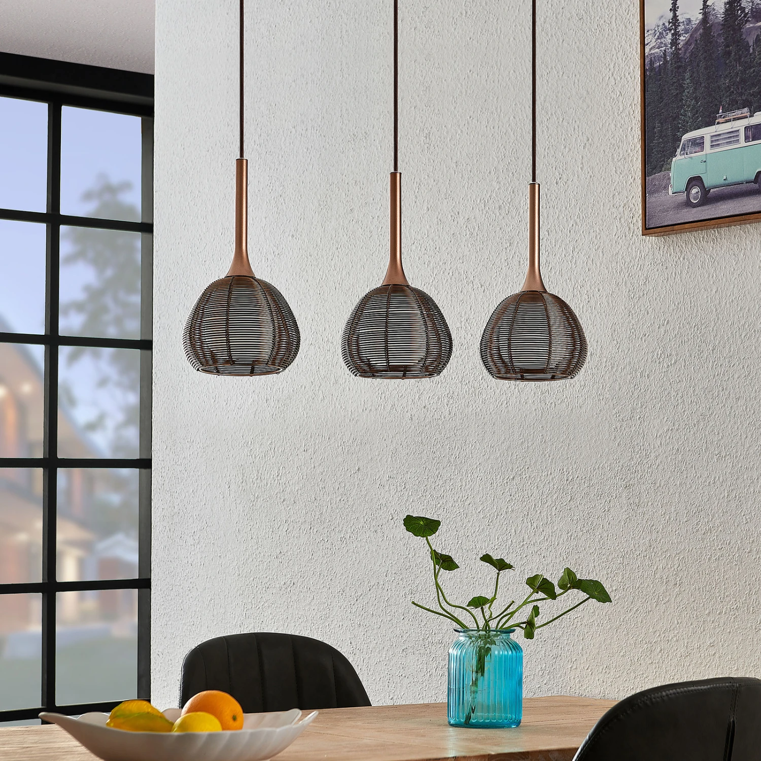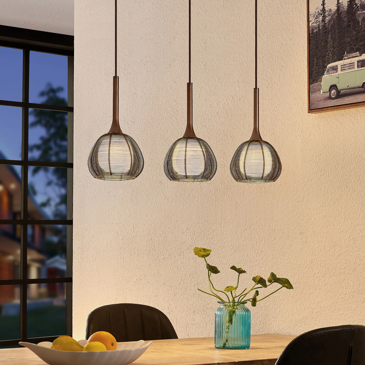 Dreiflammige Hängeleuchte Tetira mit brauner Oberfläche und attraktiven Käfigschirmen aus Metall und Glas