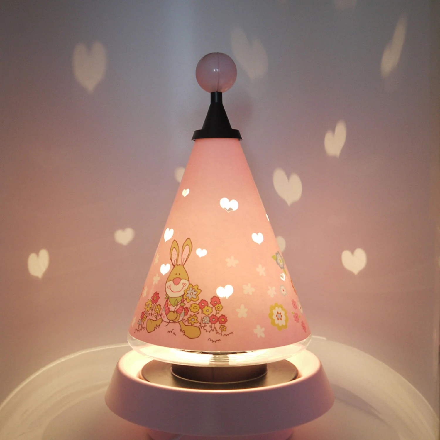 Hübsch anzusehen ist die kegelförmige Tischleuchte Bungee Bunny im Kinderzimmer schon tagsüber, denn die in schönem Rosé gefärbte Leuchte ist mit einem hübschen Hasenmotiv und vielen kleinen Blümchen verziert. Ihre ganze Pracht entfaltet sie jedoch erst mit dem Einschalten, denn dann dreht sich der Schirm dank eines leisen Motors und die kleinen Herzen werden rundherum an die Wände und Einrichtungsgegenstände projiziert. Ein- und ausschalten lässt sie sich über den in der Zuleitung integrierten Schalter.