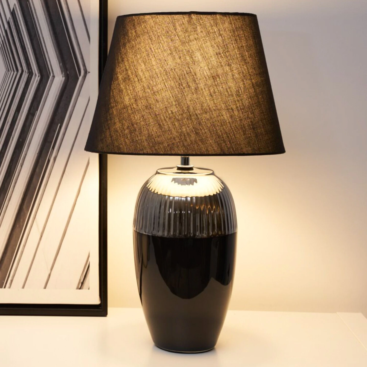 Mit einem hoch und schmal geformten Fuß aus Keramik, der im unteren Bereich schwarz und im oberen Drittel glänzend silbern und mit feinen Rillen gestaltet wurde, sowie dem schwarzen Schirm aus Stoff wird die Tischleuchte Midnight Beauty auch ausgeschaltet zu einer schönen Dekoration auf einem Sideboard oder einem Tisch. Schaltet man das Licht ein, strahlt es sehr angenehm durch den schwarzen Schirm hindurch, während es oben und unten aus den Schirmöffnungen direkt austreten kann, so dass schöne Effekte auf dem Fuß und in der Umgebung entstehen.