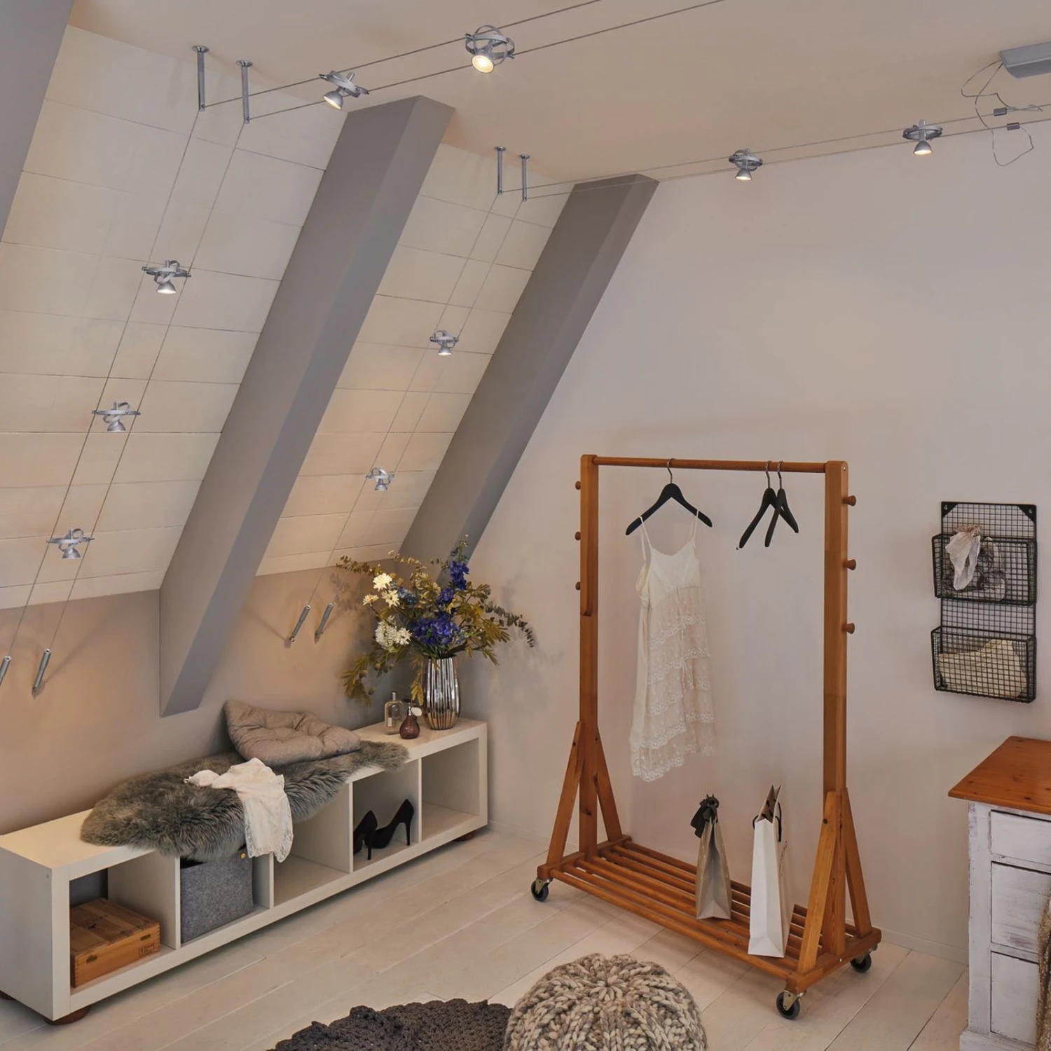 Grenzenlose Gestaltungsmöglichkeiten und eine Montagemöglichkeit an der Decke, einer Dachschräge oder an der Wand bietet das Seilsystem Cardan, das als Komplettset geliefert wird. Die acht Leuchten sind jeweils mit einer GU5,3-Fassung ausgestattet, die von zwei unterschiedlich großen, drehbaren Ringen umgeben wird. Die acht Leuchten können nicht nur am Seil beliebig positioniert werden, sie sind auch dreh- und schwenkbar, so dass sich die einzelnen Leuchten in unterschiedliche Raumbereiche ausrichten lassen und mit dem Seilsystem auch verwinkelte Räume oder lange Flure perfekt ausgeleuchtet werden können. Leuchtmittel werden nicht mitgeliefert.