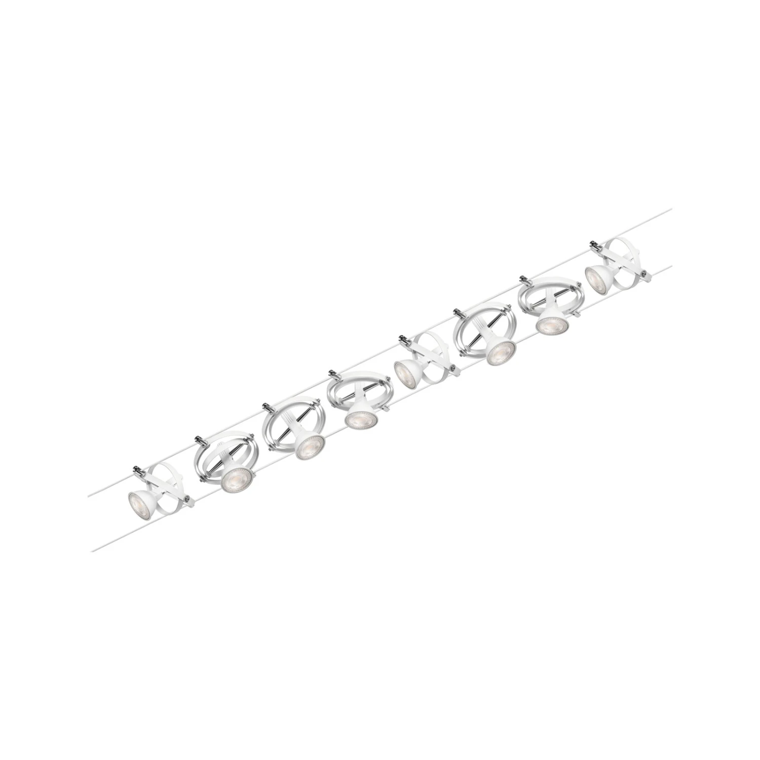 Grenzenlose Gestaltungsmöglichkeiten und eine Montagemöglichkeit an der Decke, einer Dachschräge oder an der Wand bietet das Seilsystem Cardan, das als Komplettset geliefert wird. Die acht Leuchten sind jeweils mit einer GU5,3-Fassung ausgestattet, die von zwei unterschiedlich großen, drehbaren Ringen umgeben wird. Die acht Leuchten können nicht nur am Seil beliebig positioniert werden, sie sind auch dreh- und schwenkbar, so dass sich die einzelnen Leuchten in unterschiedliche Raumbereiche ausrichten lassen und mit dem Seilsystem auch verwinkelte Räume oder lange Flure perfekt ausgeleuchtet werden können. Leuchtmittel werden nicht mitgeliefert.
