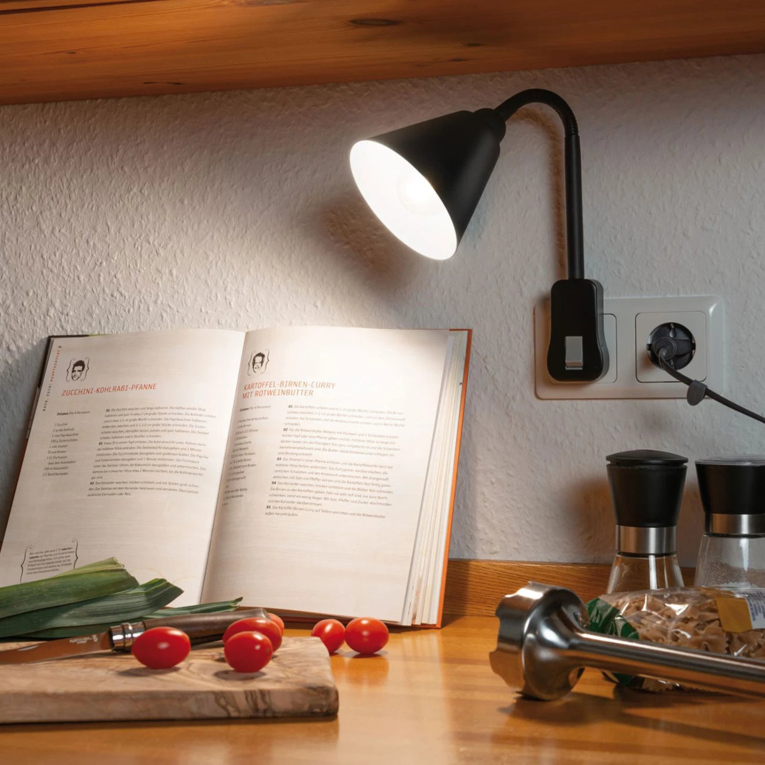 Die Steckerleuchte Junus ermöglicht flexible Ausleuchtung, die ganz einfach über den Anschluss in einer Steckdose und per installiertem Schalter an der Leuchte aktiviert werden kann. Der flexible Arm lässt den Anwender den Lichtschein so ausrichten, wie es benötigt wird.