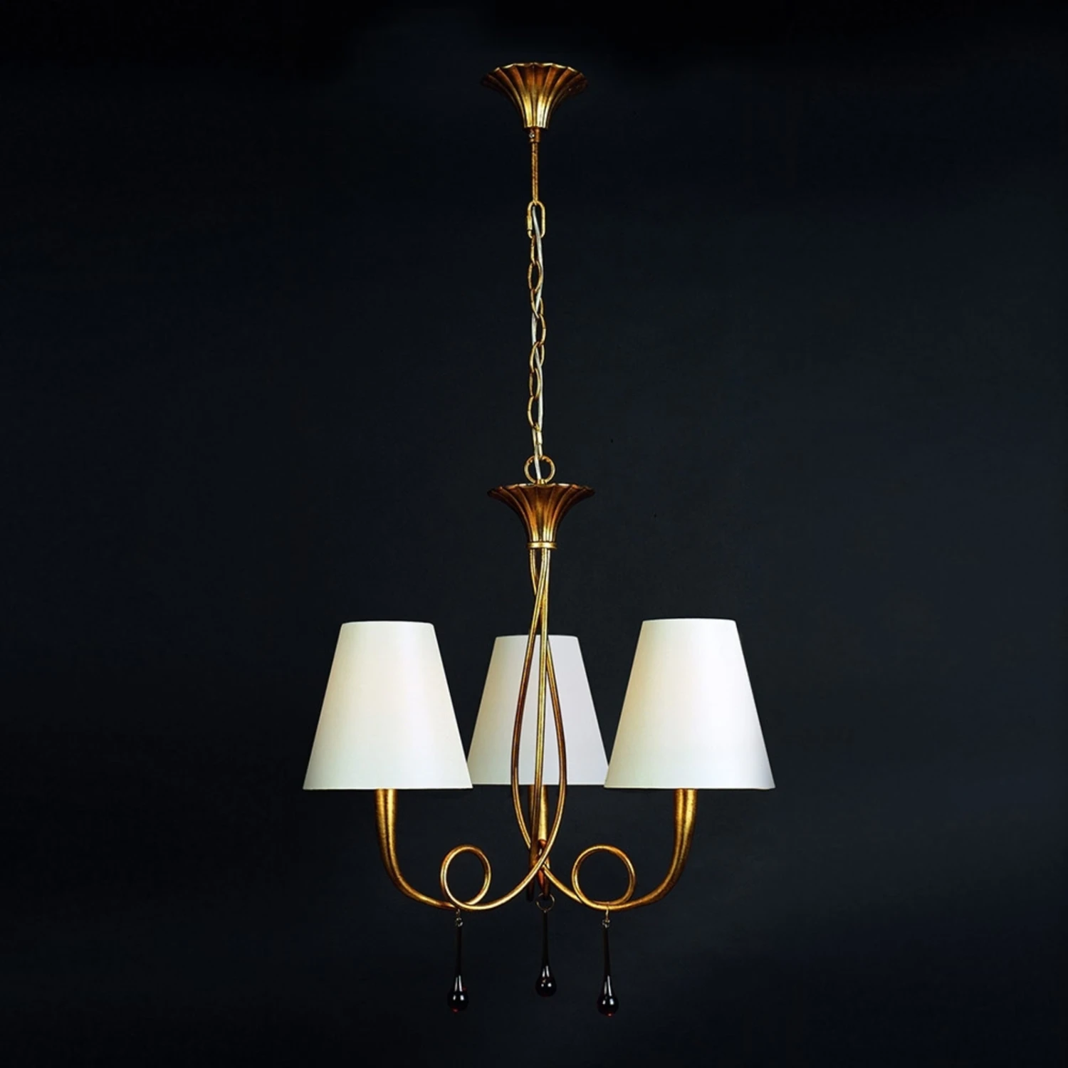 Traumhaft schön wurde die dreiflammige Pendelleuchte Paola von José I. Ballester entworfen. Goldfarbene Metallstreben, phantasievoll geschwungen und mit bernsteinfarbenen Glaskristall-Tropfen dekoriert, tragen die halbtransparenten, cremefarbenen Textil-Leuchtenschirme. Die dreiflammige Pendelleuchte Paola ist nicht nur eine ungemein dekorative Lichtquelle, sondern auch eine energiesparende, denn sie eignet sich neben herkömmlichen Glühlampen auch für den Betrieb mit Energiesparlampen oder LED-Leuchtmitteln.
