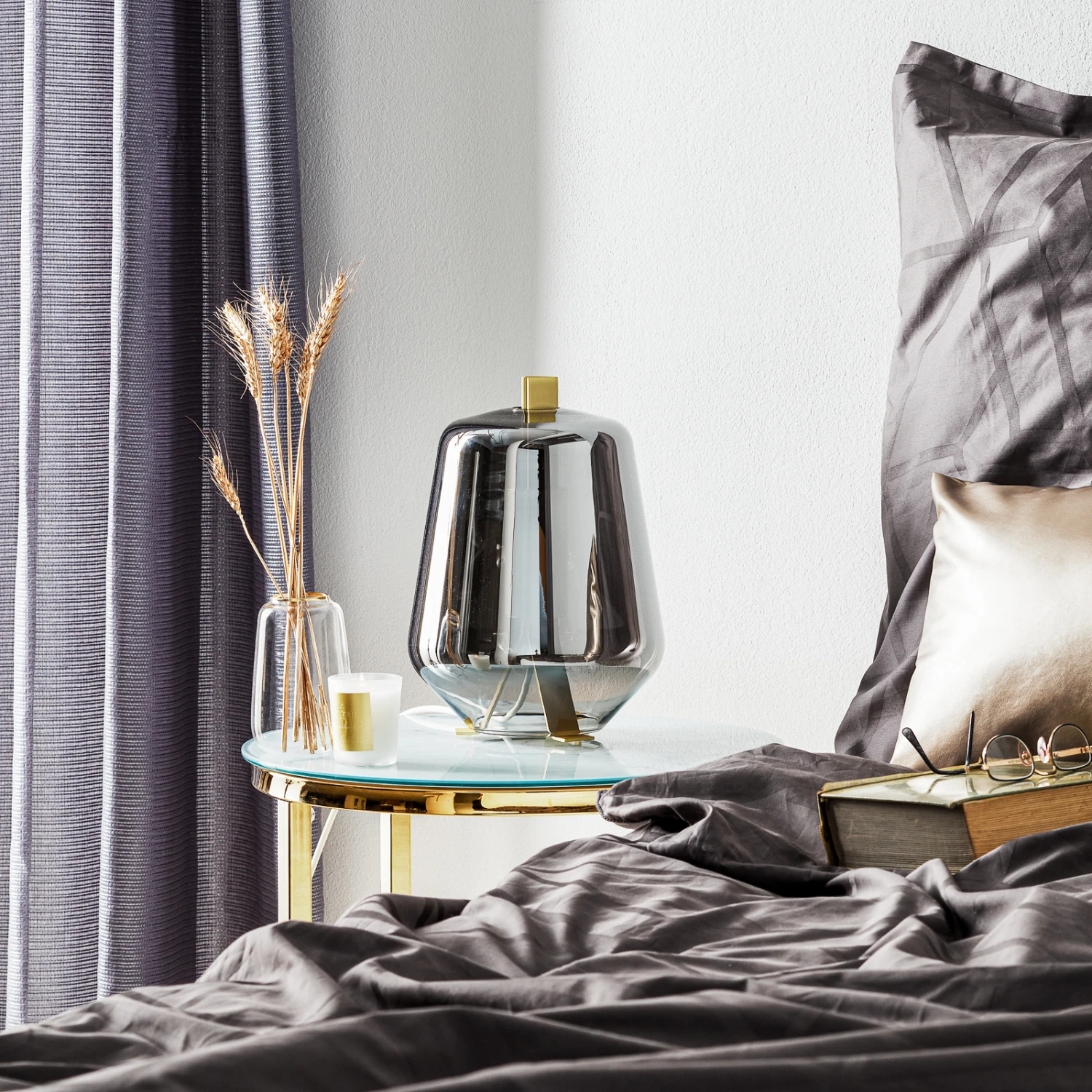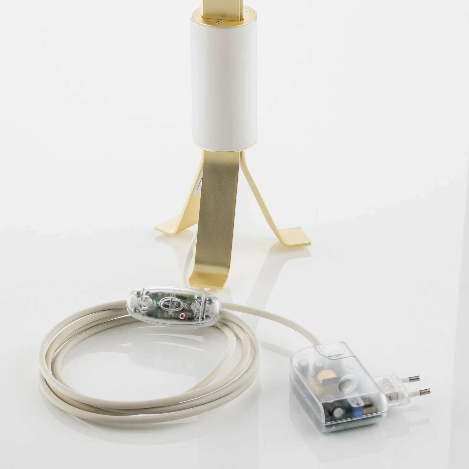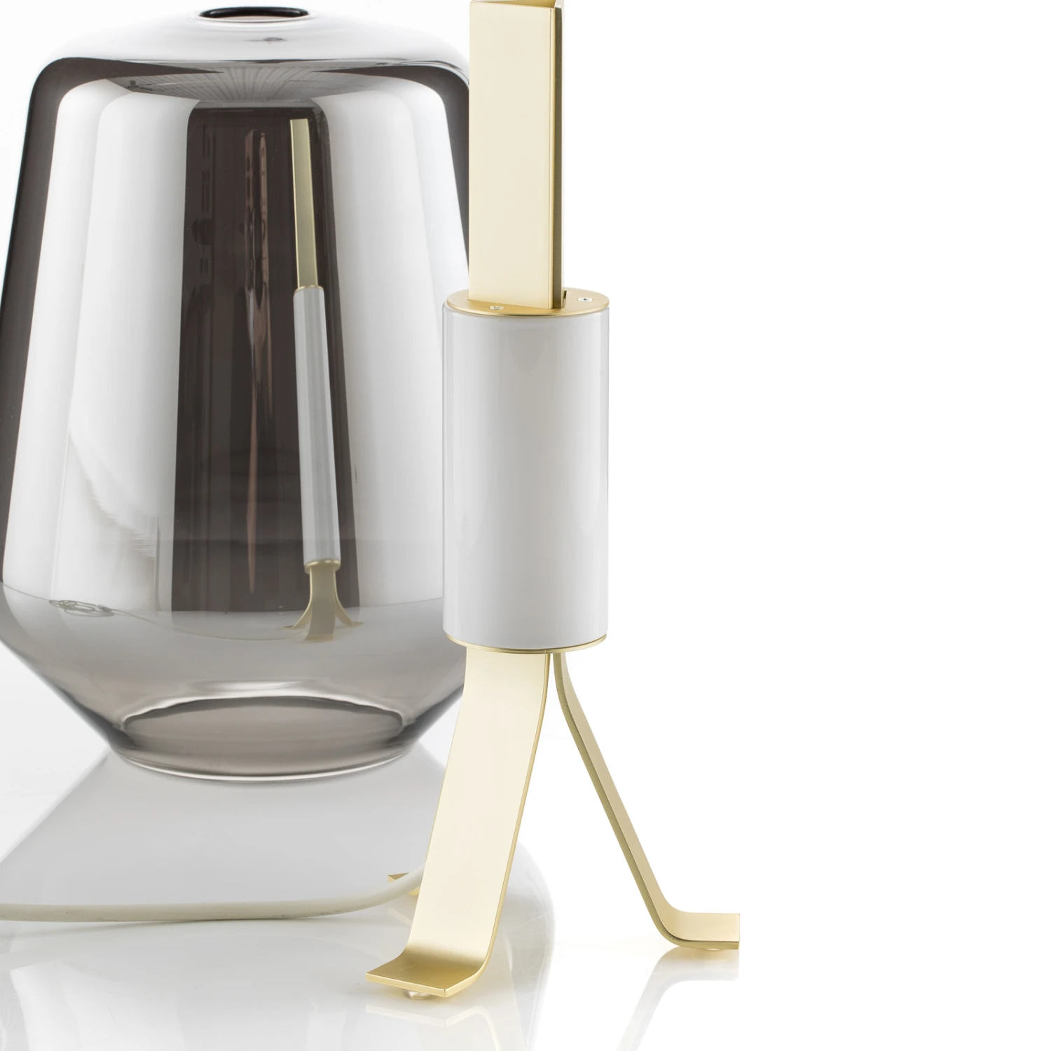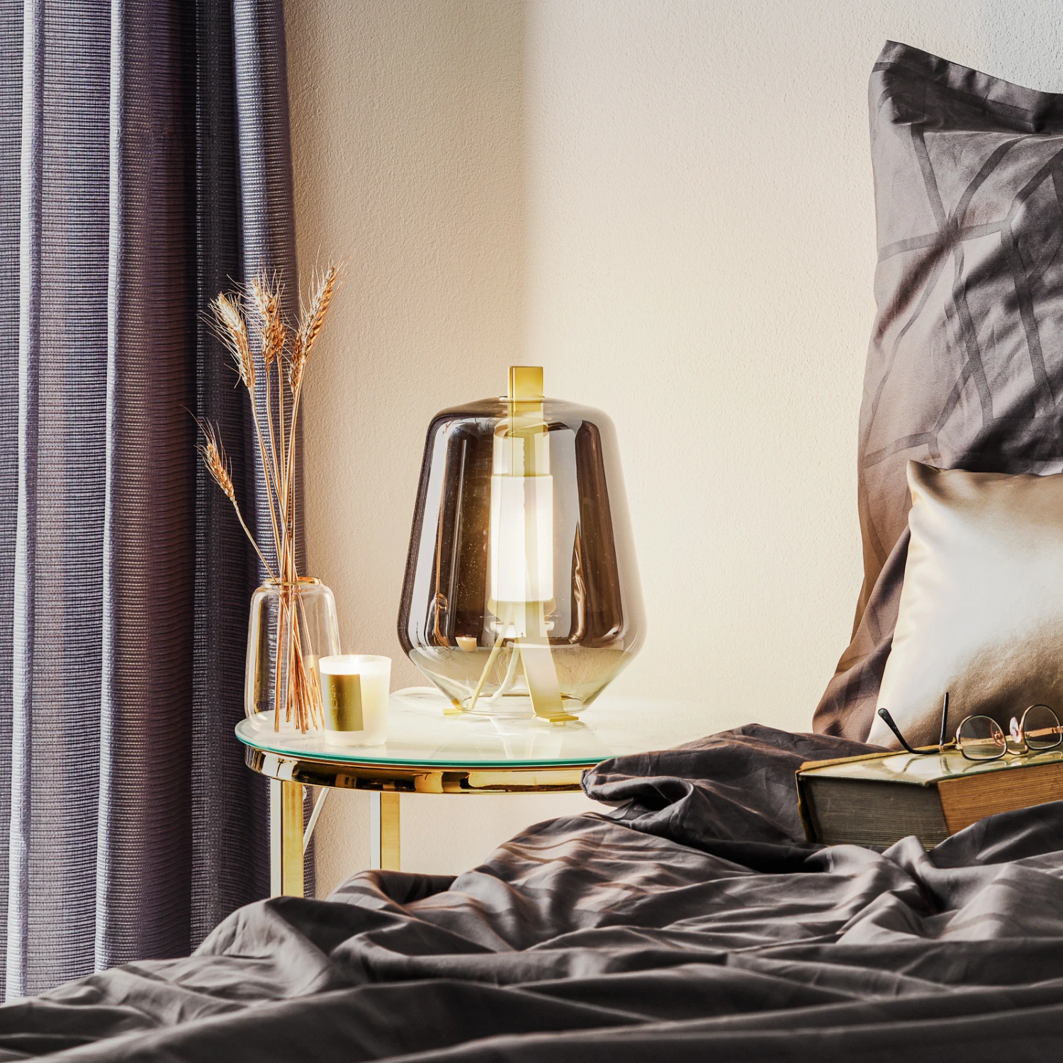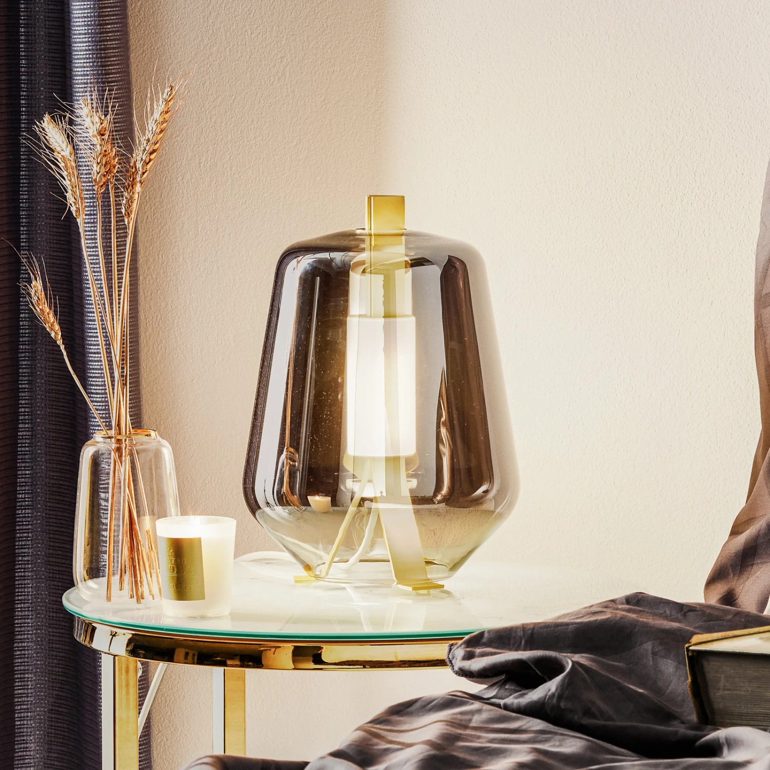 Edel und glanzvoll präsentiert sich die Tischleuchte Luisa durch die Kombination aus einem Metallgestell in Messing-Finish und einem mundgeblasenen Schirm aus Glas. Das Metallgestell zieht sich mittig durch den Glasschirm und endet unten in drei kleinen Füßen, die aus dem Schirm heraus blitzen und oben in einem Tragegriff, der ebenfalls aus dem Schirm heraus schaut. Warmweiße LEDs mit einer sehr behaglichen Lichtfarbe und einem besonders guten Farbwiedergabeindex von Ra >90 sitzen hinter den zylindrischen Diffusor in der Mitte des Schirms. Der satinierte Diffusor lässt das Licht sehr gleichmäßig strahlen. Luisa T1 ist eine glanzvolle Tischleuchte für Wohnräume, aber auch für den Nachttisch im Schlafzimmer oder auch im Hotel.
