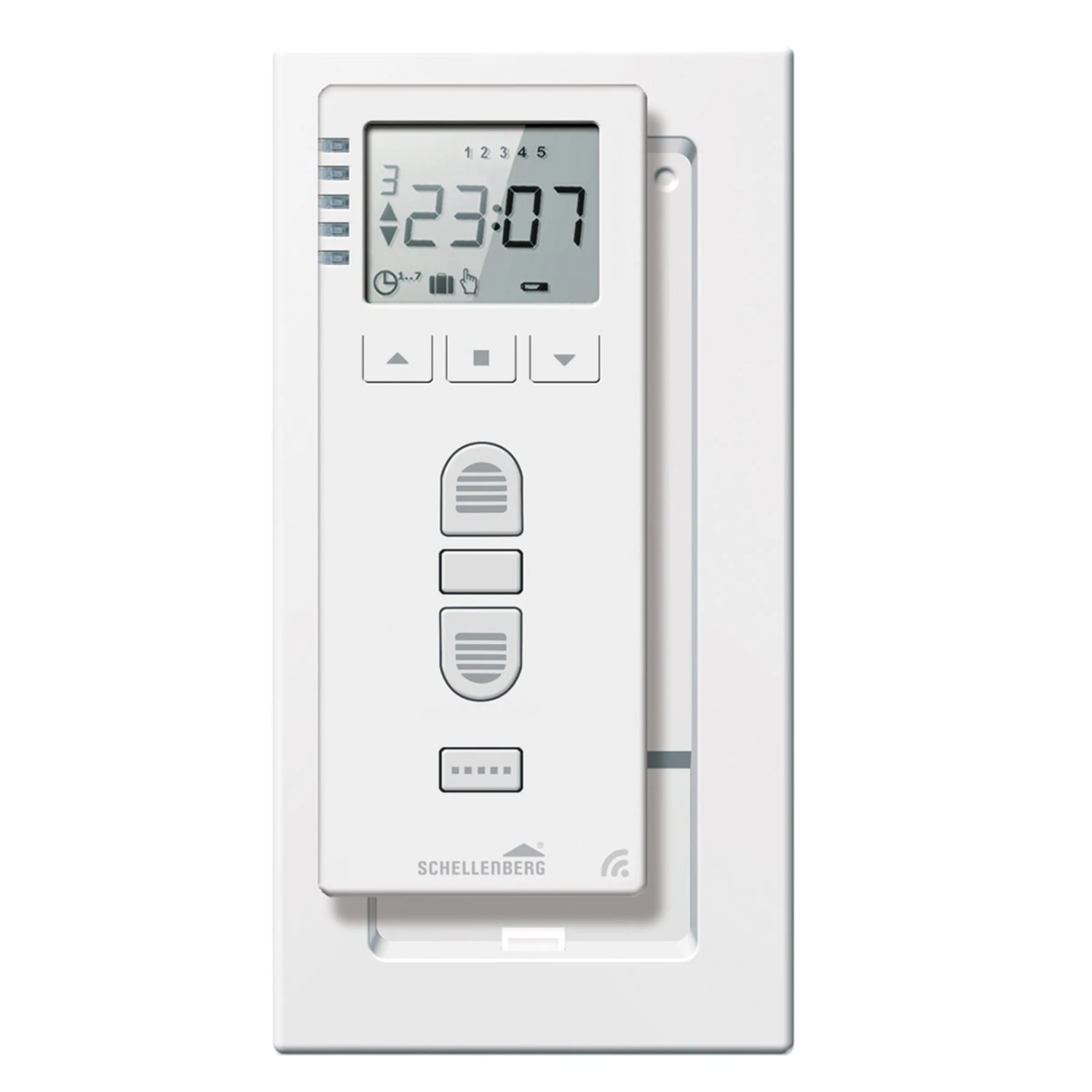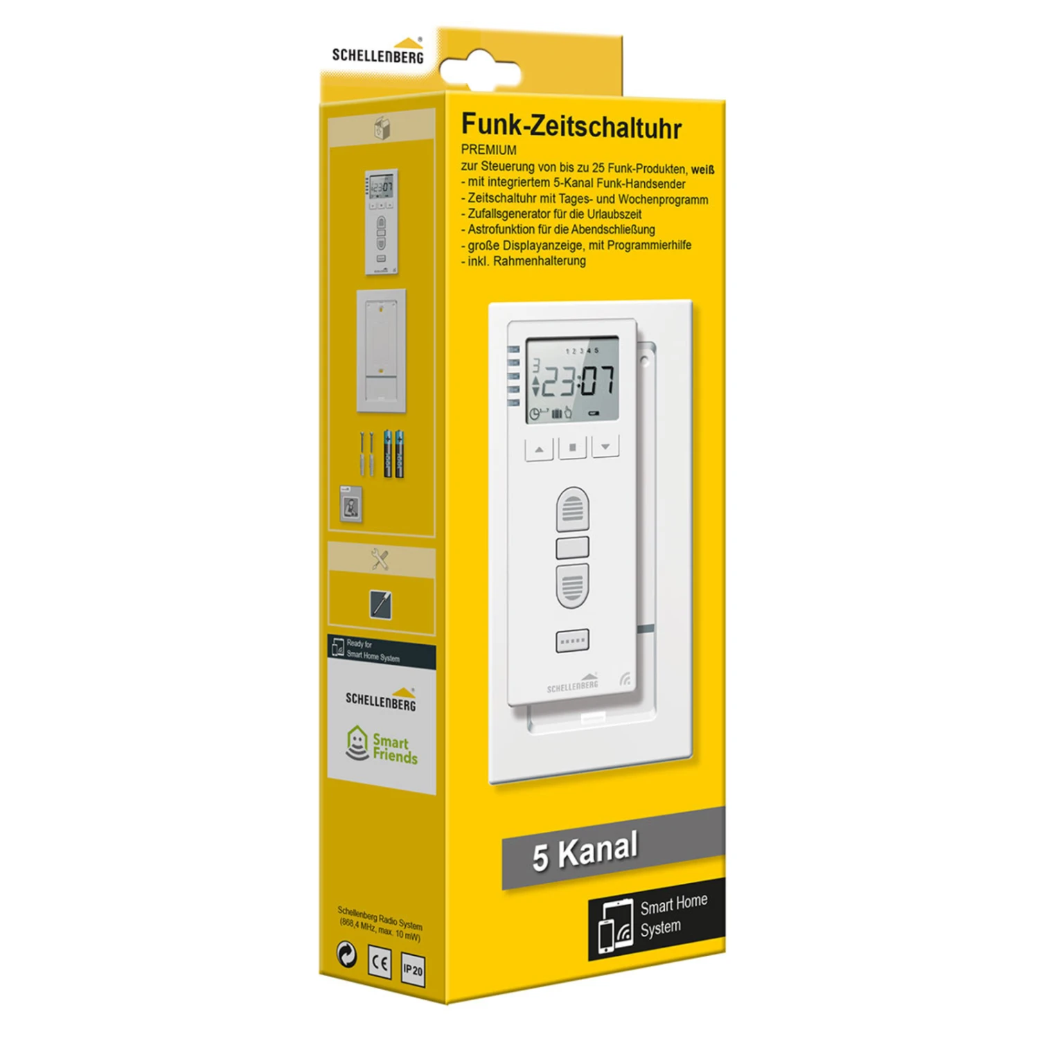 Die Schellenberg Funk-Zeitschaltuhr ist mit fünf Kanälen ausgestattet, über die Gruppen mit bis zu fünf Schellenberg-Funk-Produkten gleichzeitig angesteuert und zeitlich getimt werden können. So erreicht die Zeitschaltuhr bis zu 25 Geräte. Die Bedienung ist einfach und intuitiv, dank großem, gut lesbarem Display.