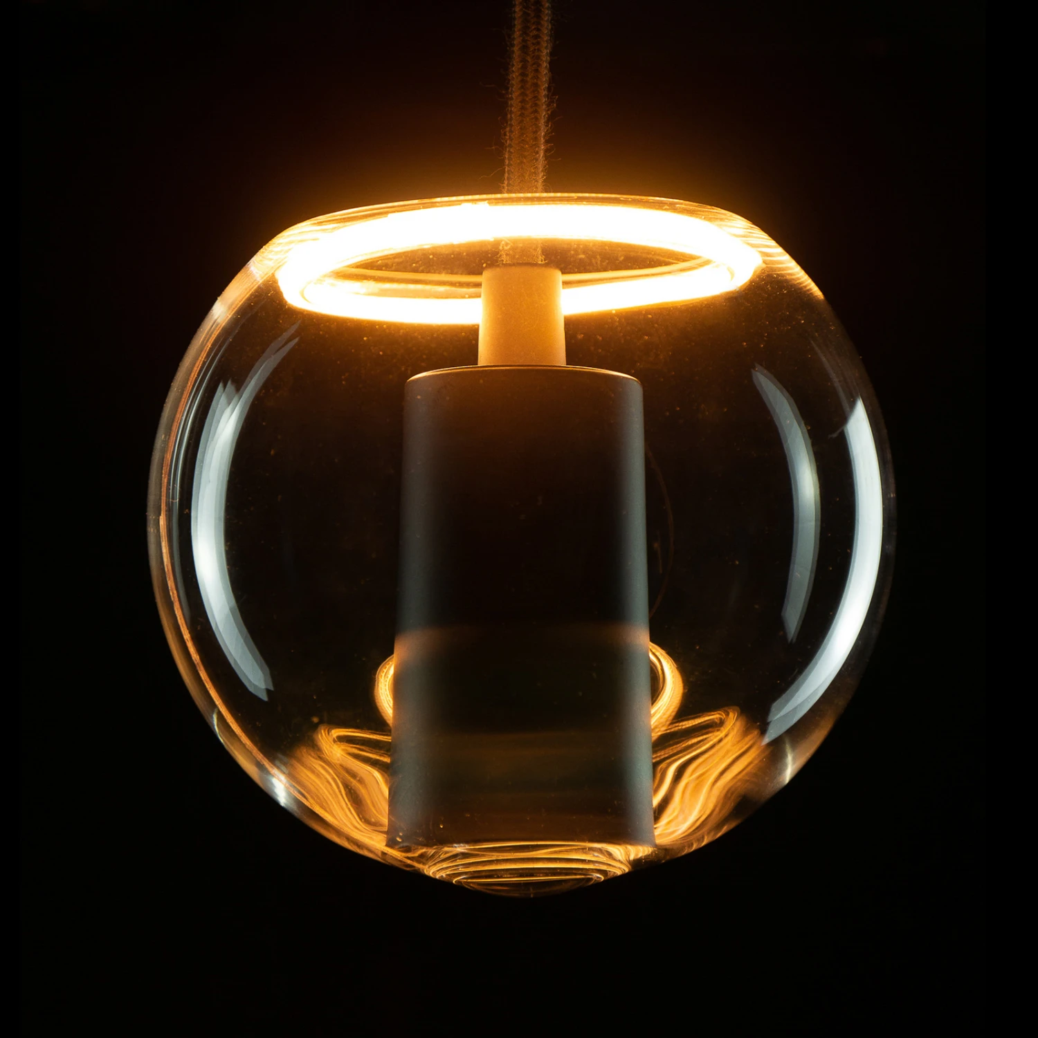 Die LED-Floating-Globelampe überzeugt mit ihrem außergewöhnlichen Design. Die E27-Fassung liegt innerhalb des klaren Glasgehäuses und wird von diesem umschlossen. So entsteht optisch ein kleiner Glasschirm durch das Leuchtmittel. Die Globelampe eignet sich daher besonders gut für Hängeleuchten ohne Schirm. Das warme Licht lässt eine angenehme Atmosphäre entstehen und kann mit einem externen Phasendimmer gedimmt werden.