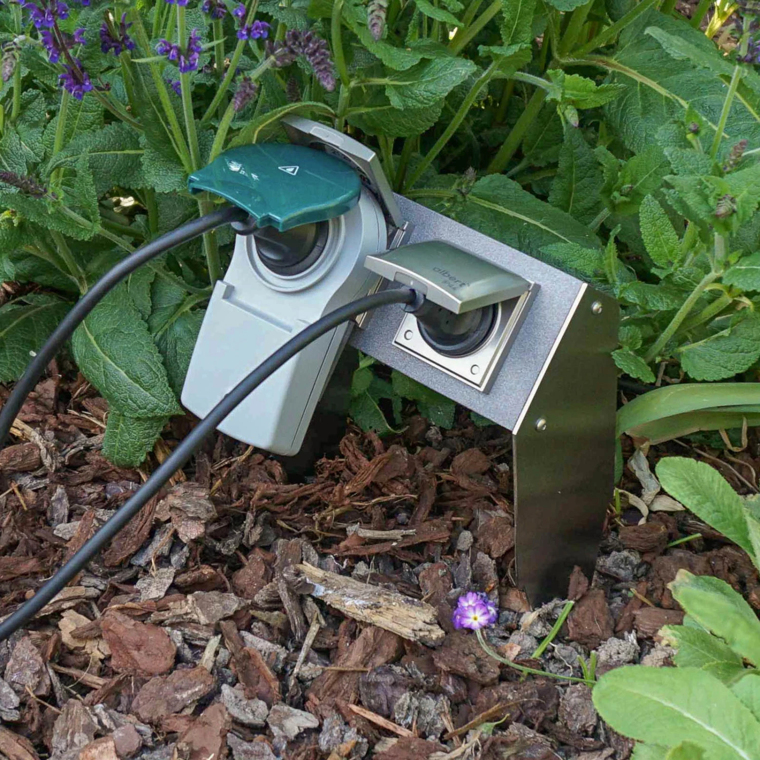 Mit diesem nahezu überall auf dem Grundstück platzierbaren Steckdosenbalken mit zwei Ausgängen lassen sich elektrische Geräte für den Außenbereich komfortabel in der Nähe des Nutzungsortes anschließen. Die Verankerung erfolgt ganz einfach mit den beiden Erdspießen im losen Untergrund. 250 cm langes Anschlusskabel mit Stecker inklusive.