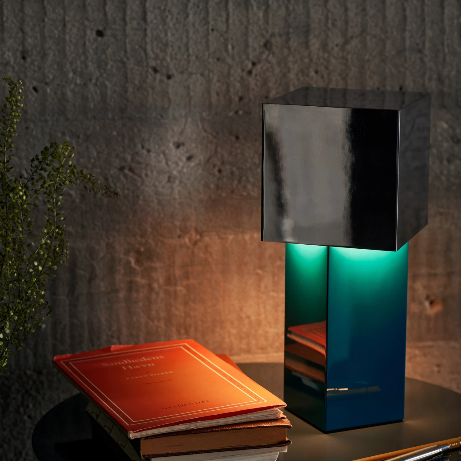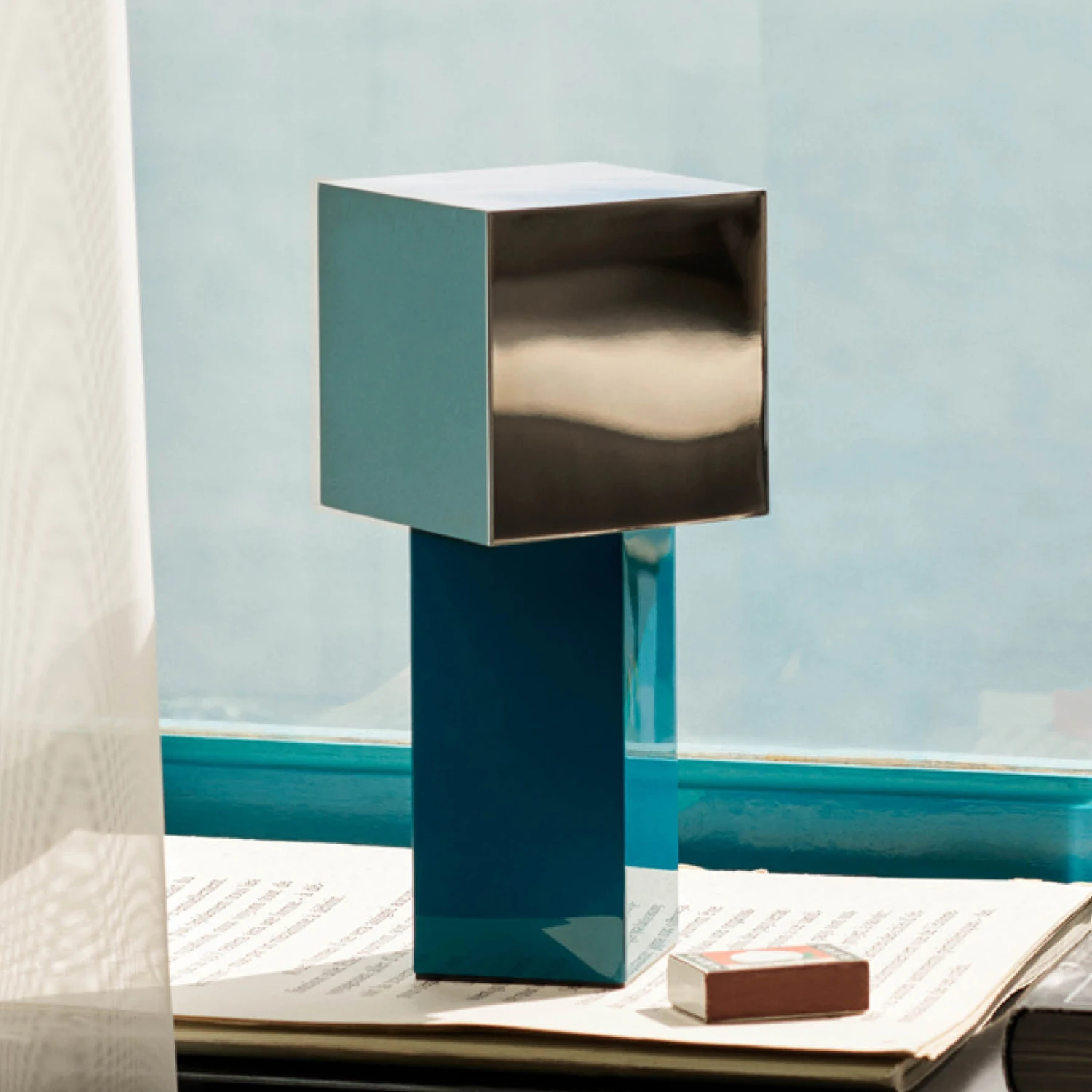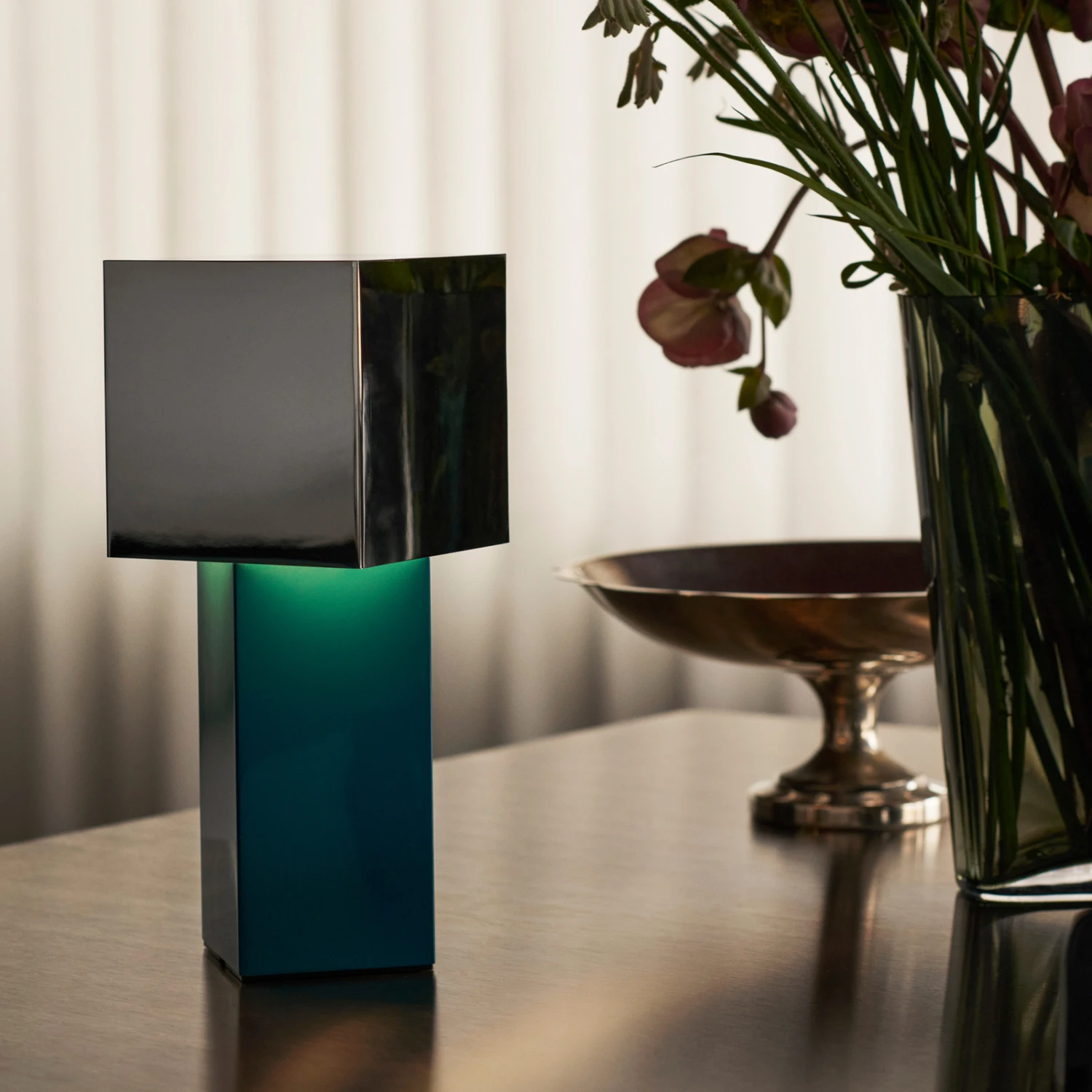 Die tragbare Tischleuchte Pivot verbindet Skulptur und Licht. Der geometrische Schirm der Leuchte ist in einem 45-Grad-Winkel zum Sockel positioniert, wodurch eine weiche Diffusion entsteht, die den warmen Schein einer modernen Kerze nachahmt. Das Ergebnis ist ein schönes Licht, das eine einladende Atmosphäre ausstrahlt.