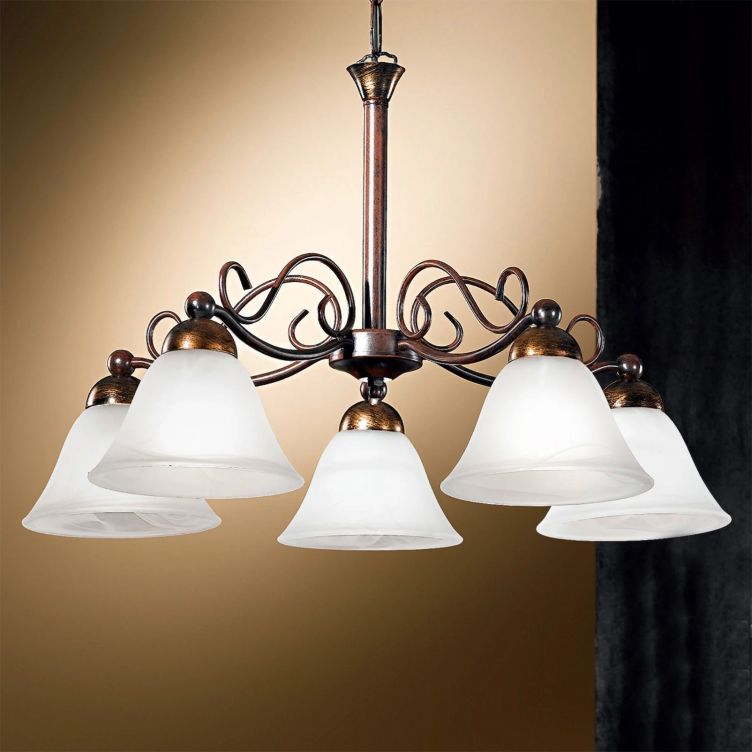 Diese Hängeleuchte verleiht einem Raum eine angenehme und wohlige Stimmung. Besonders geeignet für die Anbringung dieser Leuchte ist ein Esszimmer, welches im Landhausstil eingerichtet ist. Denn durch das Zusammenspiel der geschwungenen Elemente aus Metall mit dem Weiß der Glasleuchtschirme, welches durch Alabasterstrukturierungen gebrochen wird, entsteht ein rustikales und schönes Ambiente.